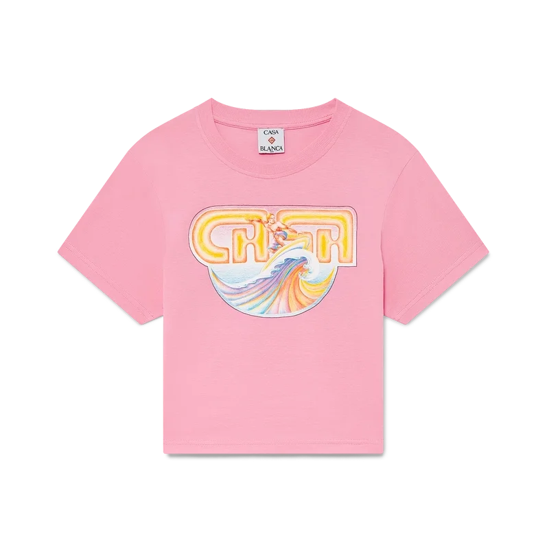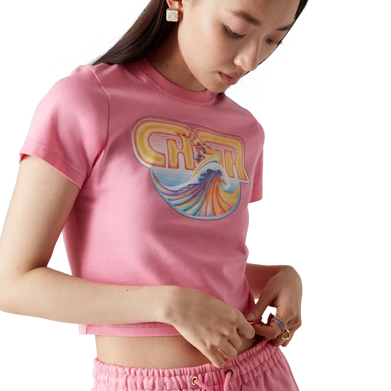 Casa Surf Cropped T-skjorte er en kortærmet T-skjorte med trykk, laget av Pima-bomull og med karakteristisk kunstverk inspirert av vintage, solblekede surfebrett fra 70-tallet. Fullført med en klassisk rund hals. Designet for å passe over navlen.