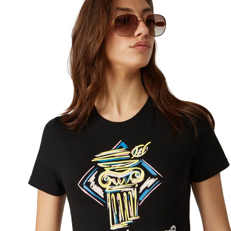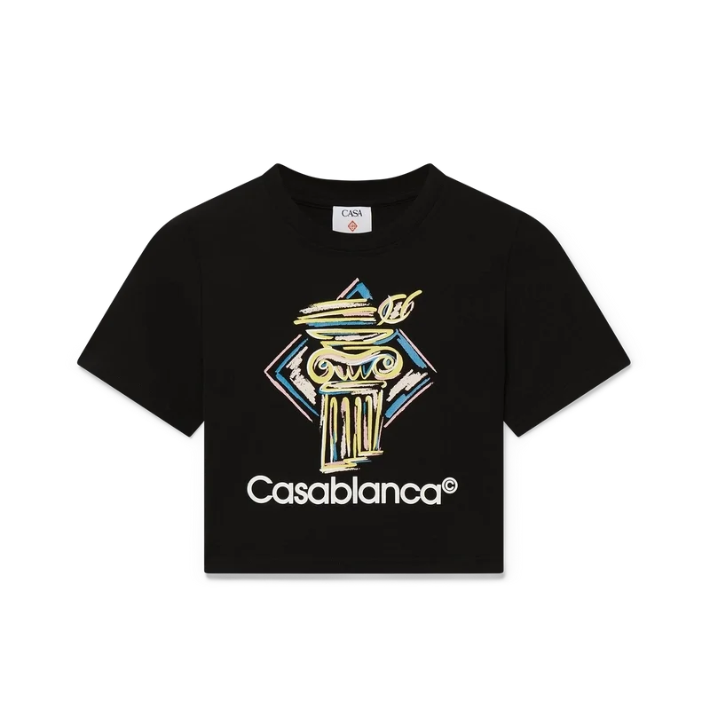 Diamond Column Baby T-skjorte er en kort, kortermet T-skjorte med trykk, laget av en bomullsblanding med husets ikoniske kritttegning av en søyle. Fullført med en klassisk rund hals – designet for å sitte over navlen.