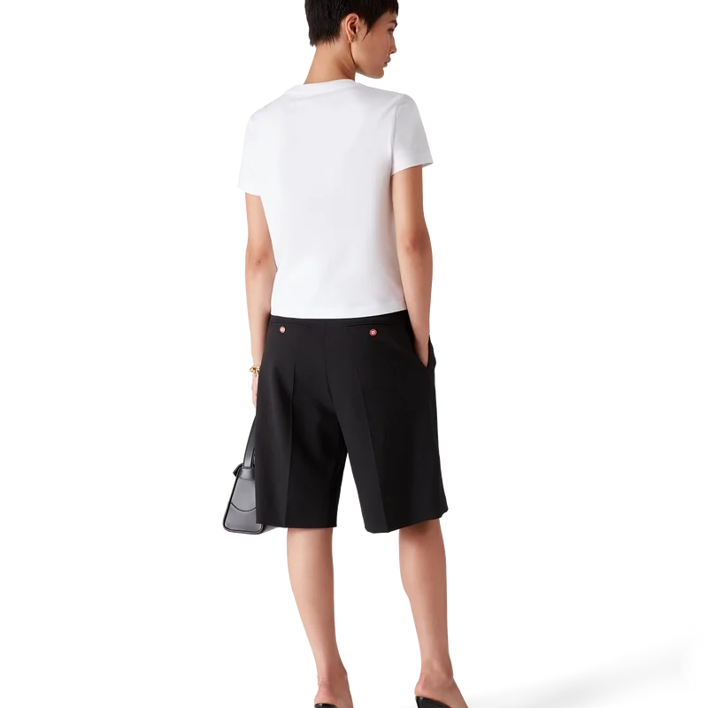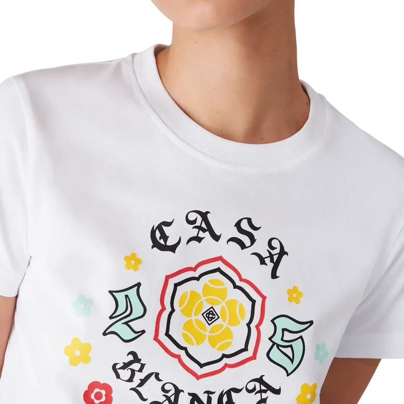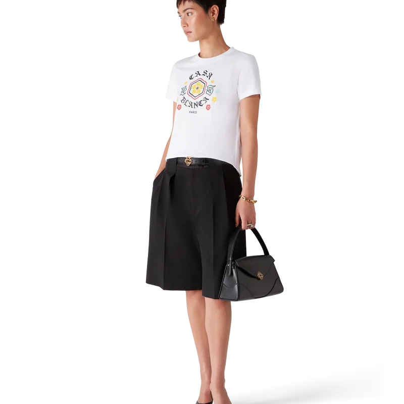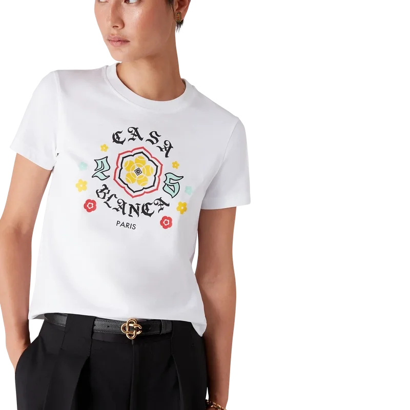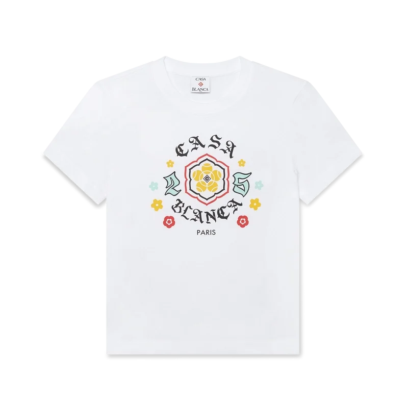 Emblem Fitted T-skjorten er en kortærmet modell med sesongens kunstverk, hvor vi hentet inspirasjon fra den japanske subkulturen BōSōZoku til et av våre hovedtemaer. Kontrasten mellom grafiske elementer og tekst føltes veldig Casablanca for oss. Vi skapte vår egen tolkning av BōSōZoku-kunstverk, og innlemmet setninger som beskriver merket, som «Looking at the Beauty of the World». Layoutet er ukonvensjonelt, men komposisjonen er nøye balansert, noe som gir den en unik, men harmonisk følelse. Fullført med en klassisk rund hals.
