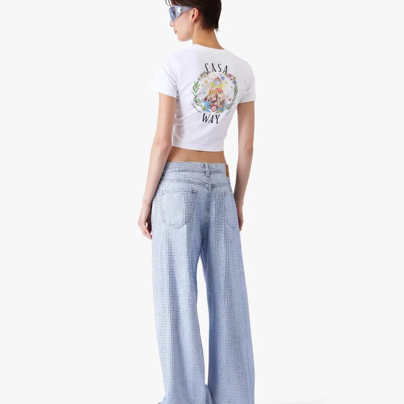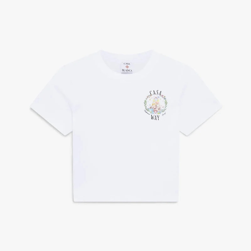 White Casa Way Baby-T-skjorte med korte ermer har et kort snitt og er prydet med sesongens Casa Way-motiv, som skildrer den utopiske visjonen om Ibiza som et reisemål for en nesten religiøs oppdagelsesreise gjennom øyas mangfoldige musikalske landskap. Den har en klassisk rund hals og en slank passform.