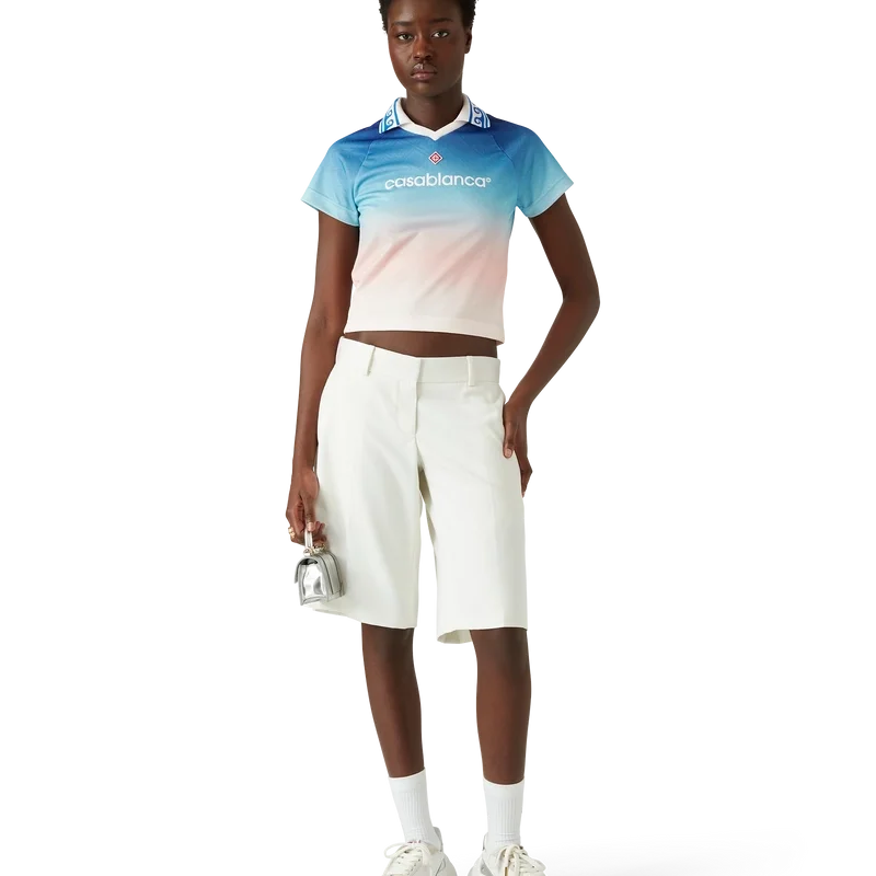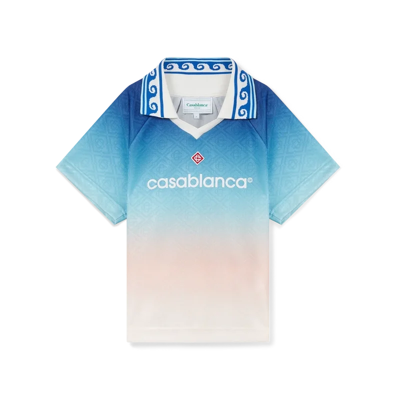 Jacquard Monogram fotballskjorten er en tettsittende, kort modell med korte ermer, designet med husets karakteristiske Diamond Monogram. Laget av et gradient Jacquard Monogram-stoff og fullført med husets karakteristiske Diamond Monogram-logo-applikasjon, en kontrastfarget ribbkrage og et Casablanca-logo på brystet.