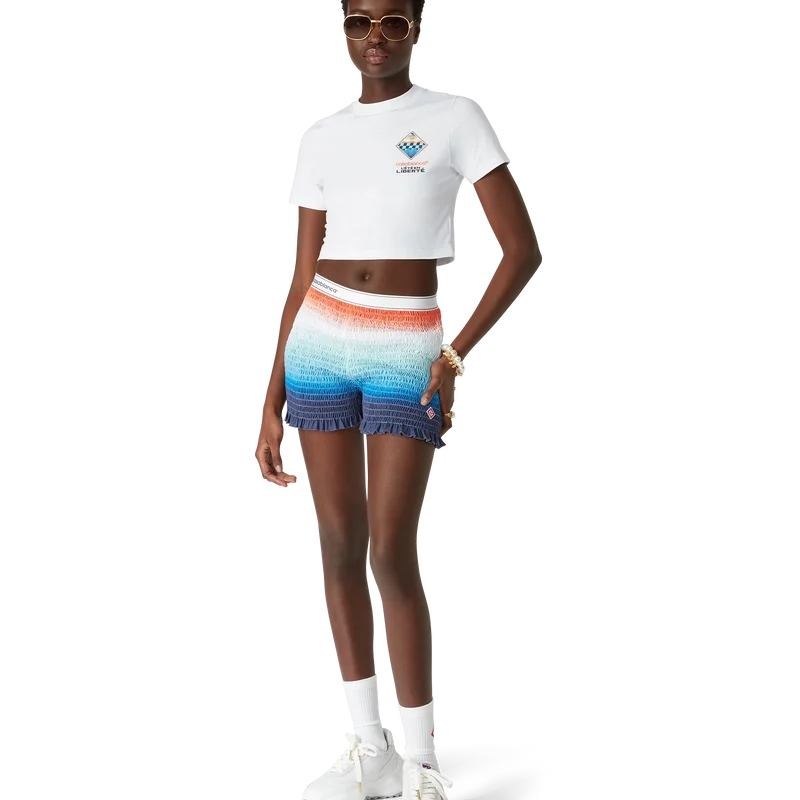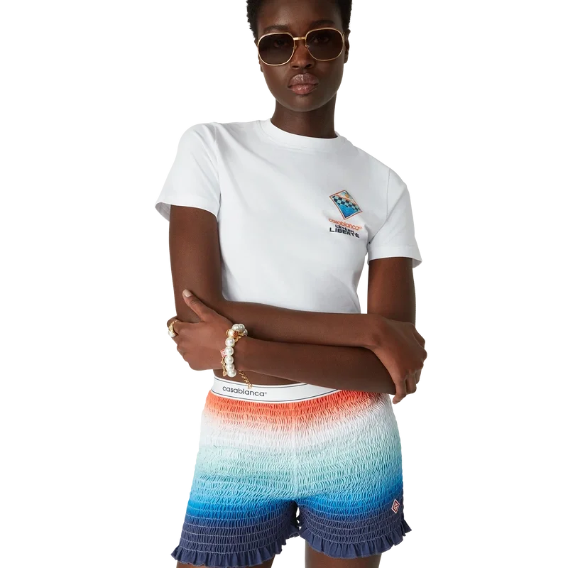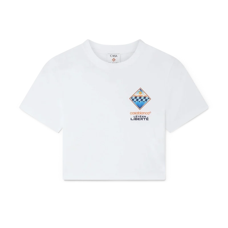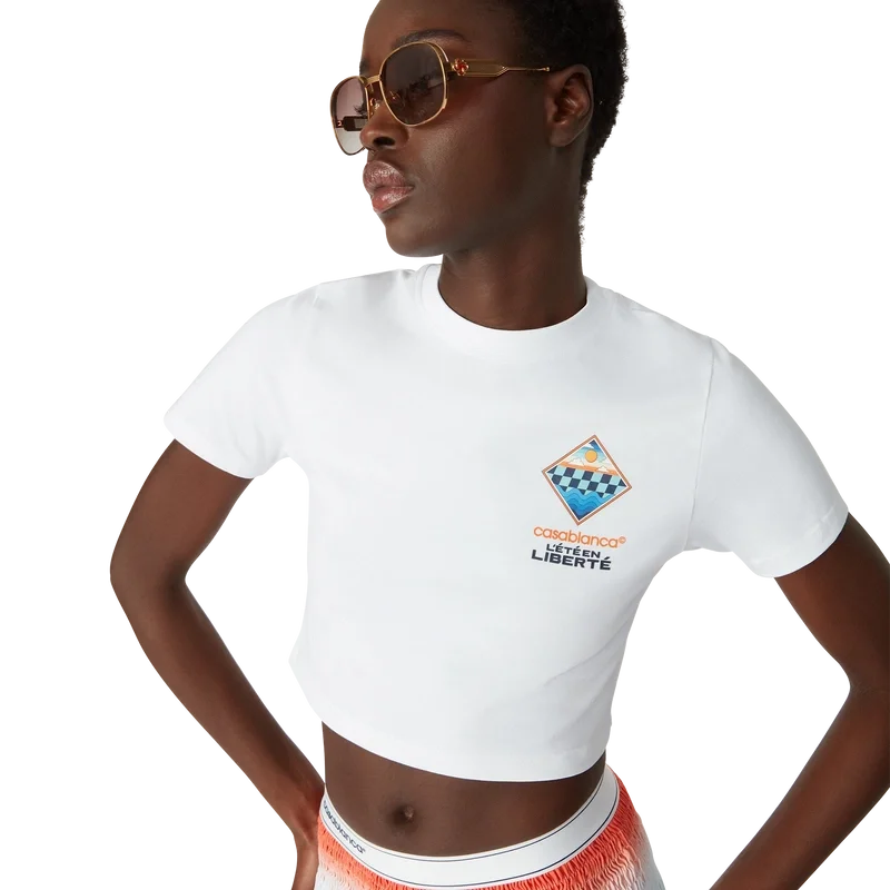 L’ÉTa En Liberta Cropped T-skjorte er en kortærmet T-skjorte med trykk, laget av økologisk bomull, og prydet med merkets sesongbaserte kunstverk med designelementer hentet fra naturen, arkitektur og tennis. Den har en klassisk rund hals. Designet for å sitte over navlen.