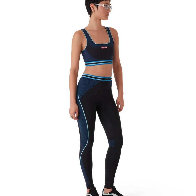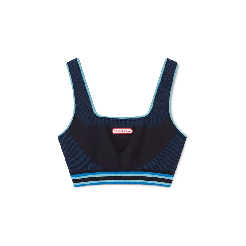 Den sømløse braletten er et ermeløst design inspirert av sportsklær, med husets sammenflettede Cc-logo i midten, laget av et elastisk stoff. Fullført med et elastisk bånd med husets Casablanca-logo, stropper, paneldetaljer og en rund hals.