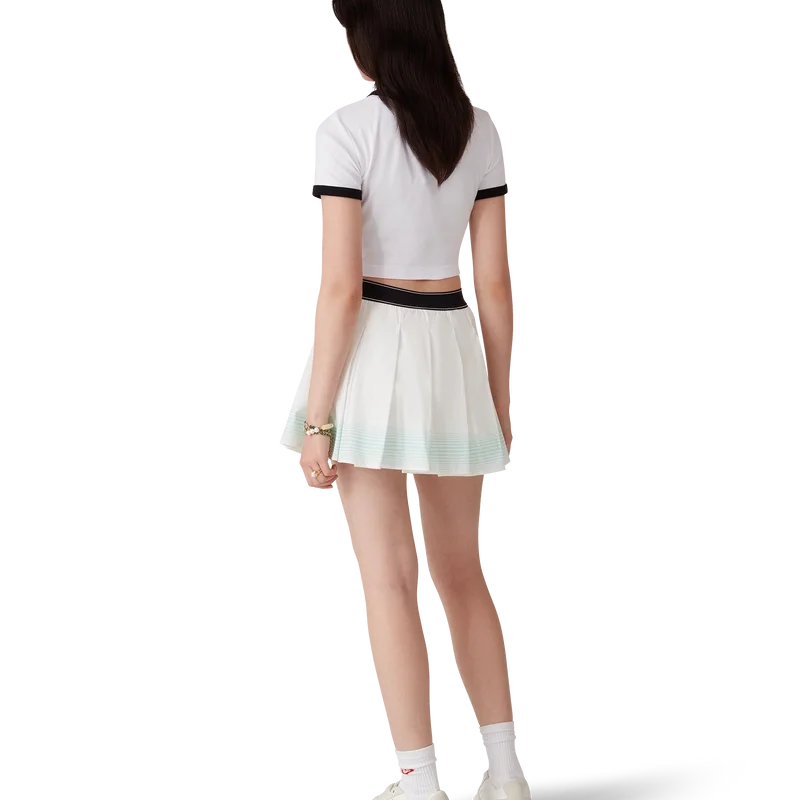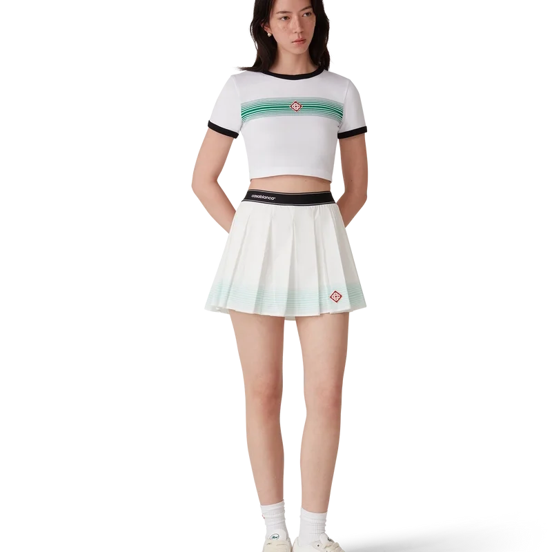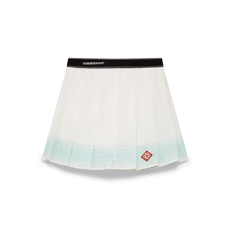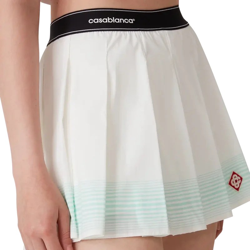 Den stripete plisserte miniskjørtet er en kort modell med husets karakteristiske diamantlogo. Fullført med en kontrastfarget elastisk linning med et Casablanca-logo i boksprint, en grønn horisontal gradientstripe i kanten og tilpassede underbukser.