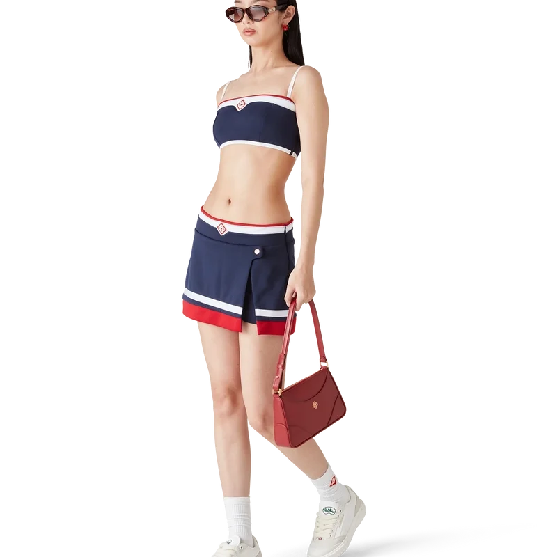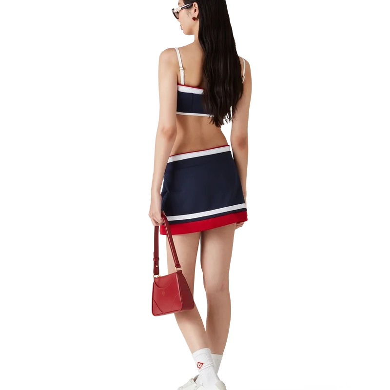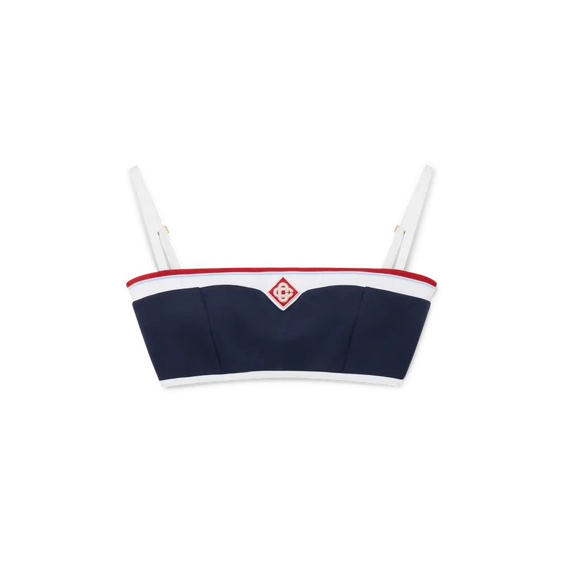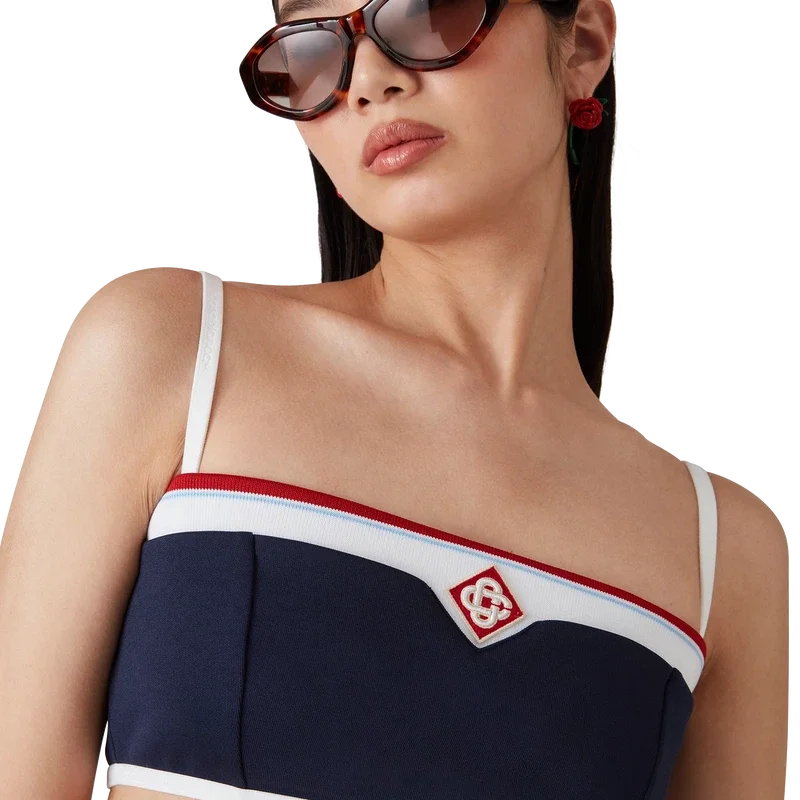 Tricot-braletten er et ermeløst design inspirert av sportsklær, med husets karakteristiske Diamond Monogram i midten. Plagget er laget av trikotstoff, med spaghettistropper og stripete kantdetaljer.