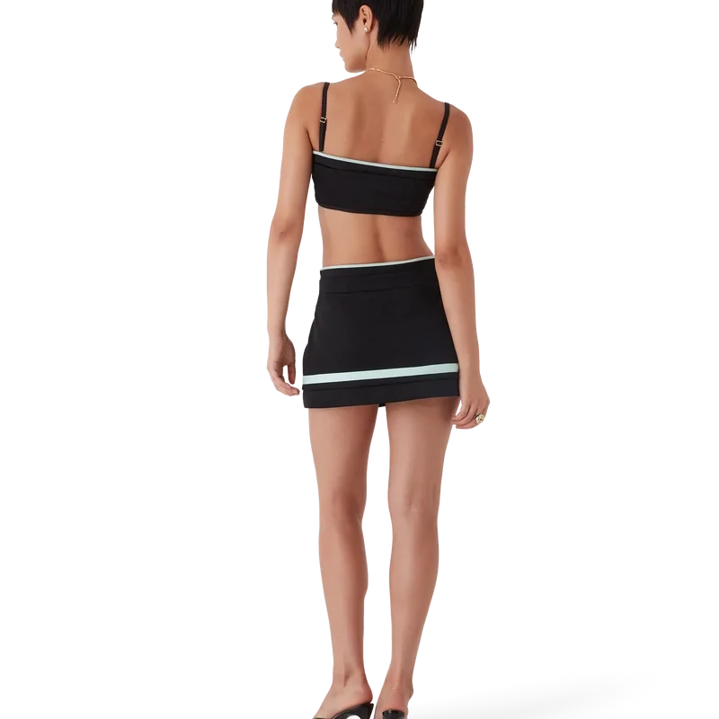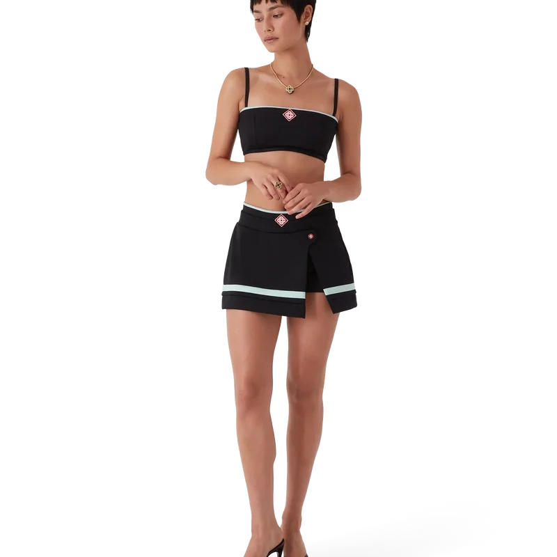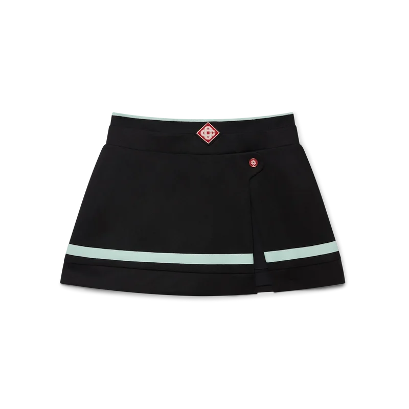Tricot-miniskjørtet er et kort design inspirert av sportsklær, med husets karakteristiske Diamond Monogram i midten. Det har en ribbestrikket linning, en flat CC-logo-knapp, innvendige shorts, en spalte, horisontale striper i svart, hvitt, mint og rødt nederst og glidelås i siden.