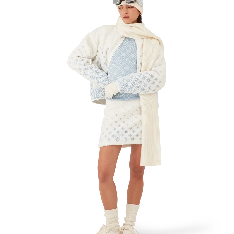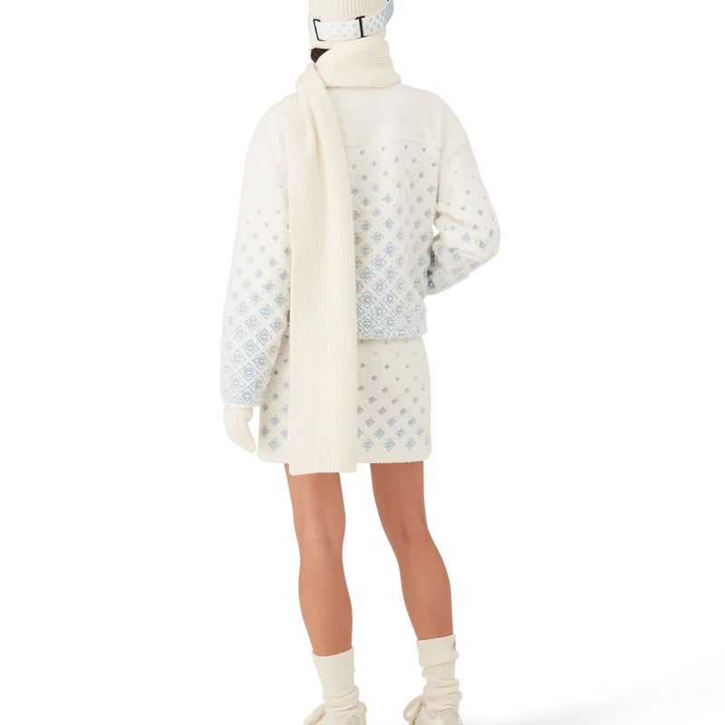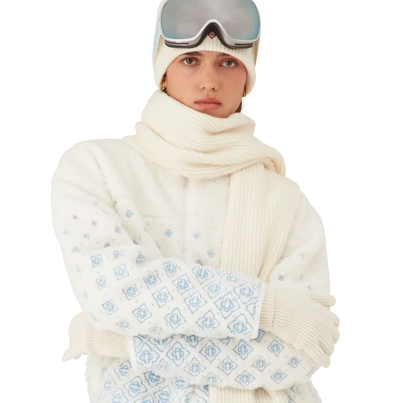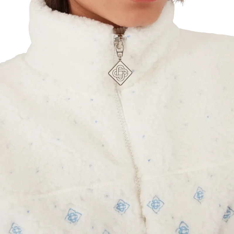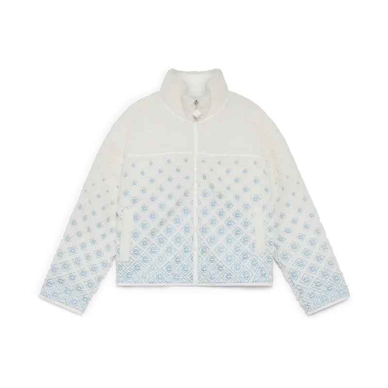 Den broderte, korte fleecejakken med gradientmonogram er et raffinert yttertøydesign laget av teknisk fleecestoff i hvitt, inspirert av de myke teksturene i Japans legendariske puddersnø. Den henter inspirasjon fra den innbydende komforten i det tradisjonelle livet på landet, der dampende varme kilder tilbyr en pause fra vinterkulden og mykt snøfall demper omverdenen.
