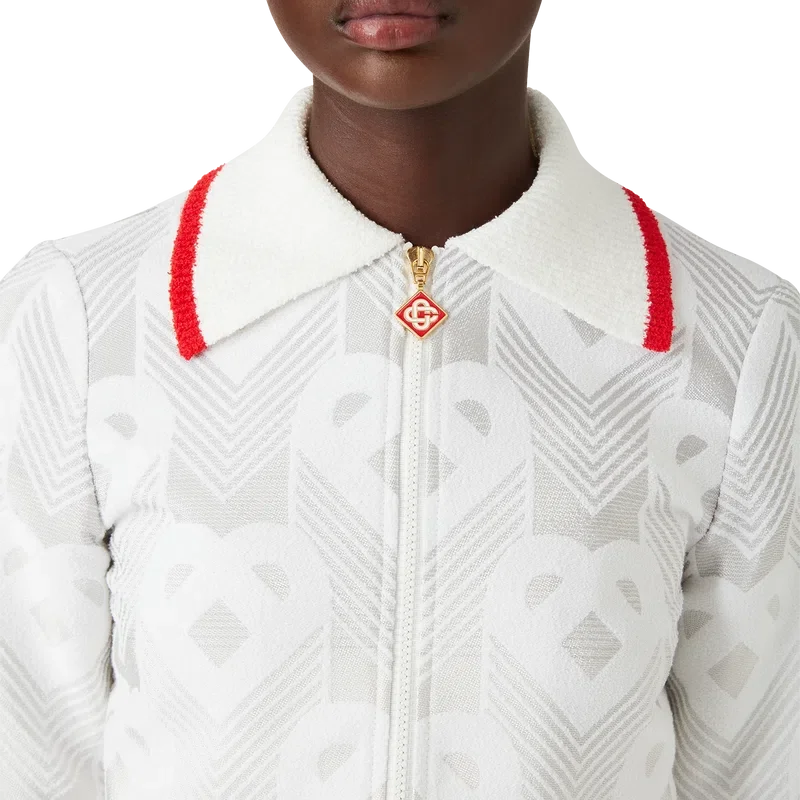Gradient Heart Monogram-frottéjakken har et heltrykt design med husets hjerte-monogram på sesongens grå gradientbakgrunn. Laget av et monogram-frottéstoff i bomullsblanding og utstyrt med glidelås, krage, elastisk kant nederst og mansjetter.