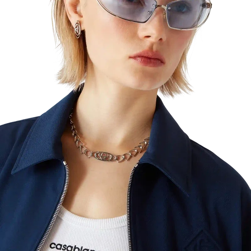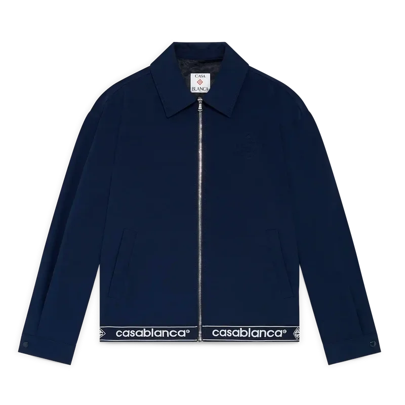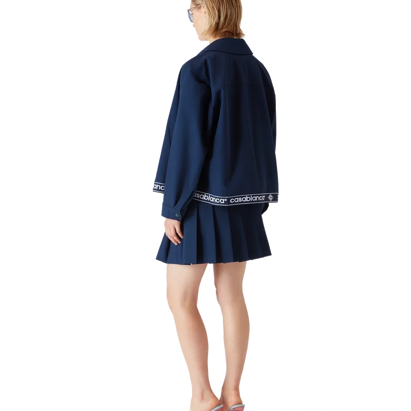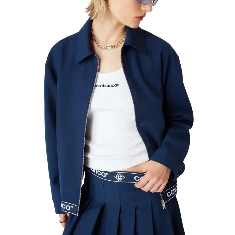 Den marineblå ulljakken er et sportslig skreddersydd design laget av ullblandingsstoff, som gjenspeiler husets raffinerte tilnærming til dresser. Fullført med glidelåslukking med Diamond Monogram på glidelåstappen, spiss krage, sidelommer med kant, bånddetalj i kanten med Casablanca-logoen og stripet kantdetalj.