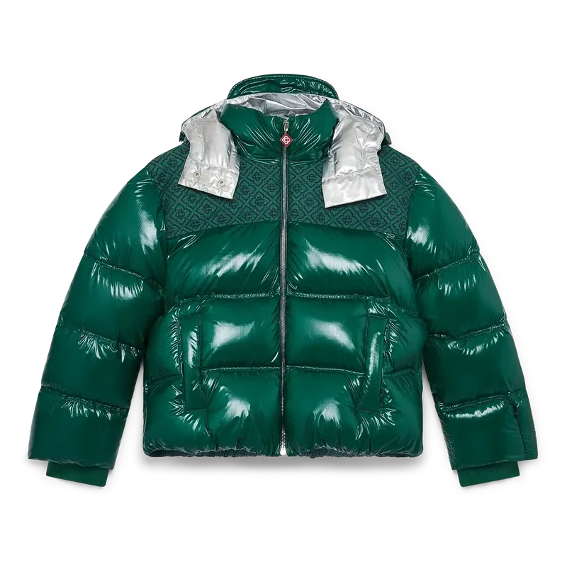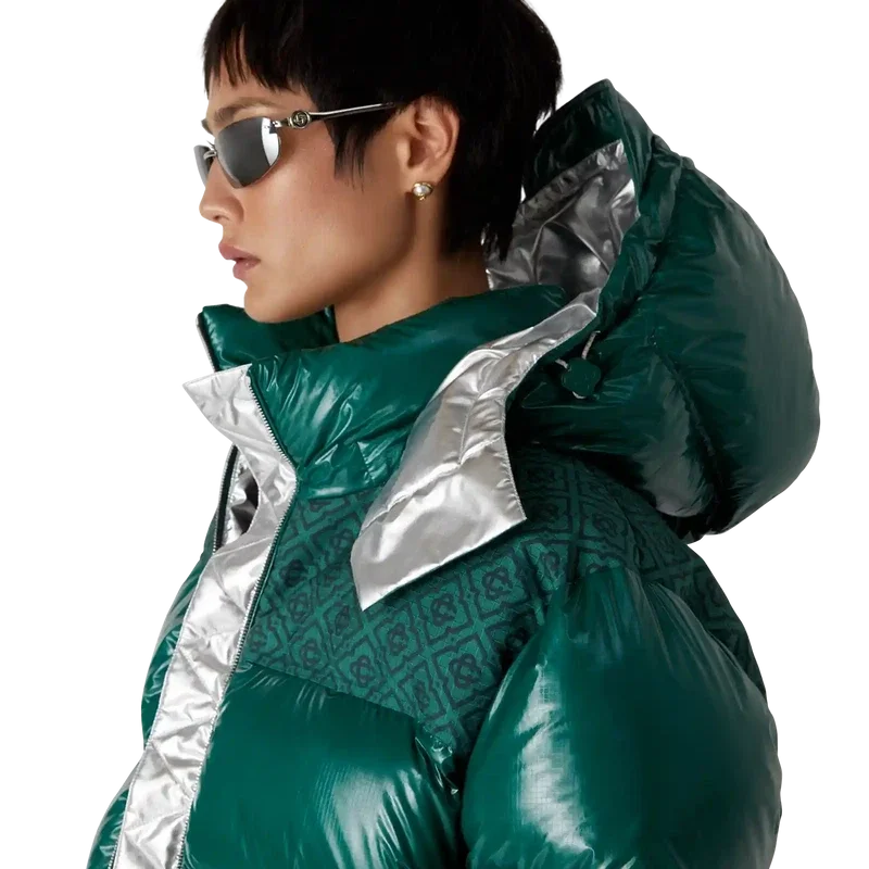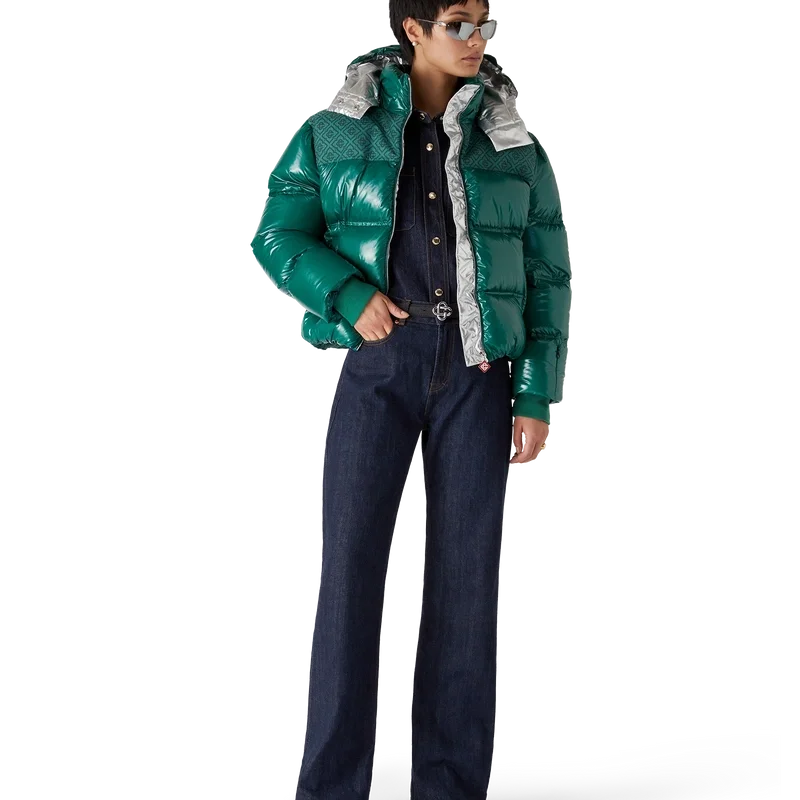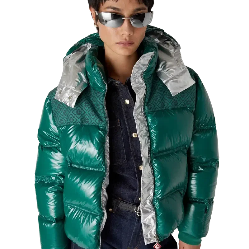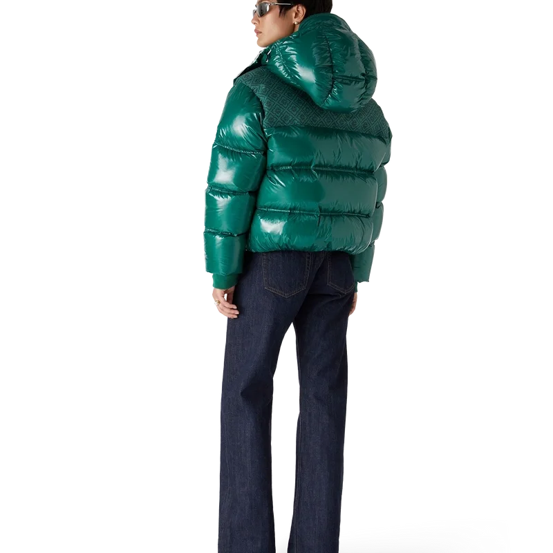 Nylon-pufferjakken er et moderne, boksformet yttertøydesign laget av ripstop-nylon med dunfyll og kontrastfarget monogram-jacquardpanel over skuldrene. Den har hette med Cc-logo-knapper og snøring, en stående krage som gir ekstra varme og beskyttelse mot vær og vind, glidelås med husets karakteristiske diamantlogo på glidelåstappen, frontlommer med glidelås, justerbare mansjetter med merke og elastisk kant og mansjetter.