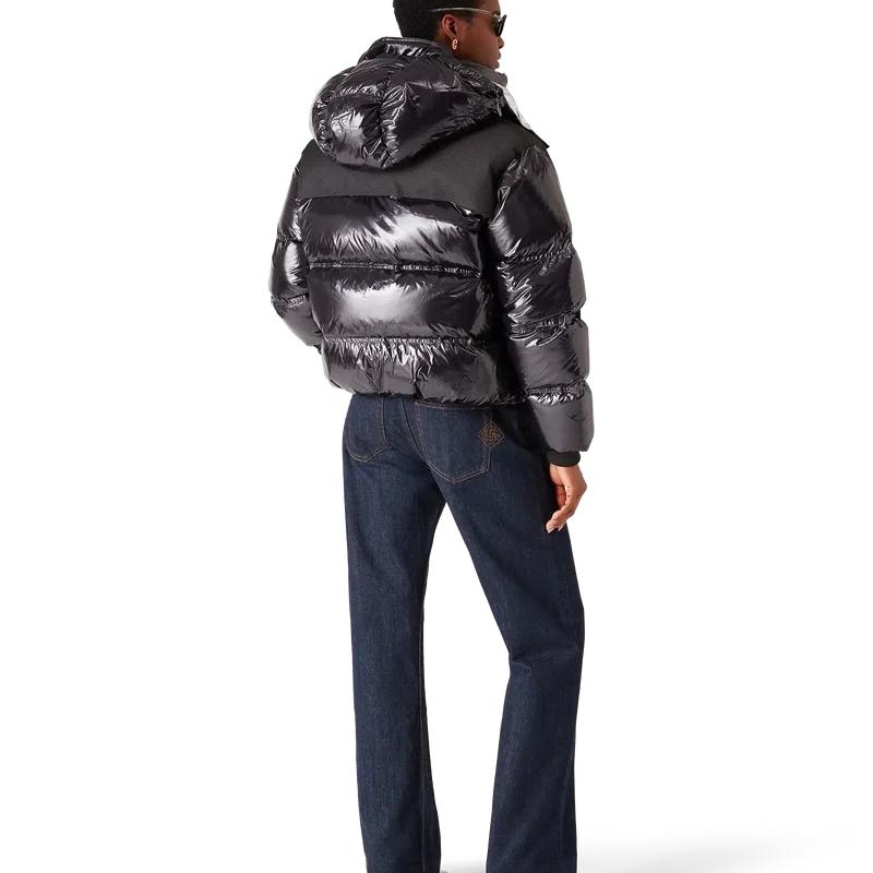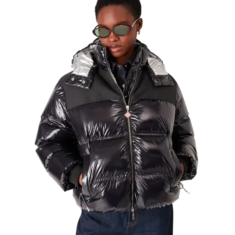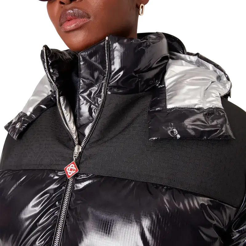 Nylon-dunjakken er et moderne, boksformet yttertøydesign laget av ripstop-nylonstoff med dunfyll og kontrastfarget monogram-jacquardpanel over skuldrene. Den har hette med Cc-logo-knapper og snøring, en stående krage som gir ekstra varme og beskyttelse mot vær og vind, glidelås med husets karakteristiske diamantlogo på glidelåstappen, frontlommer med glidelås, justerbare mansjetter med merke og elastisk kant og mansjetter.
