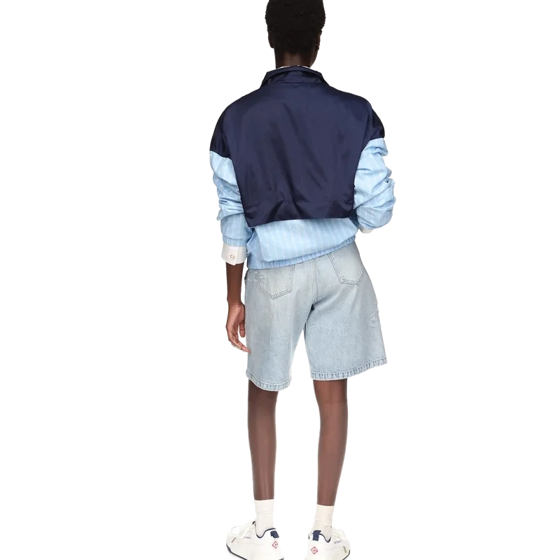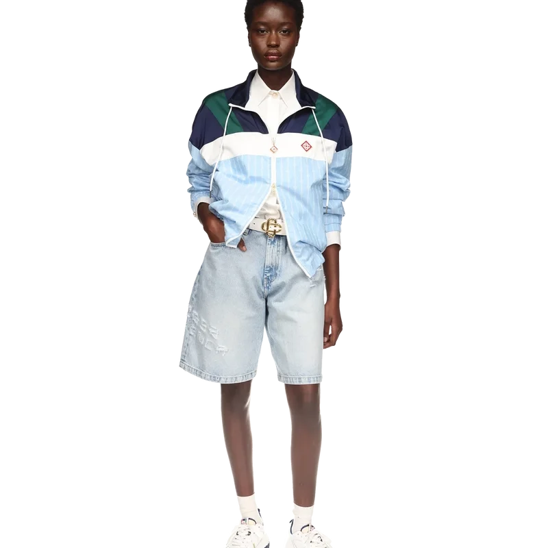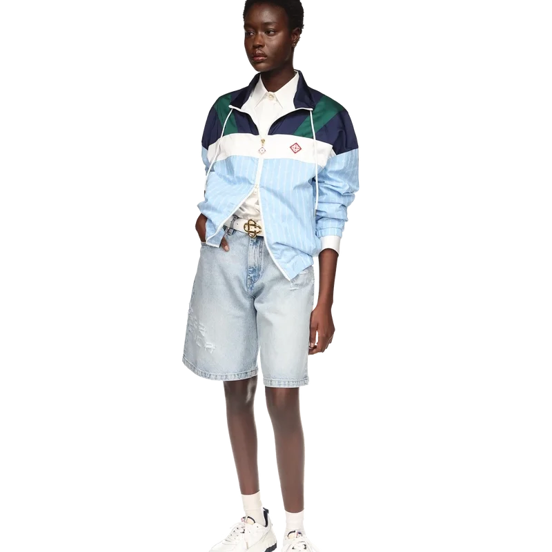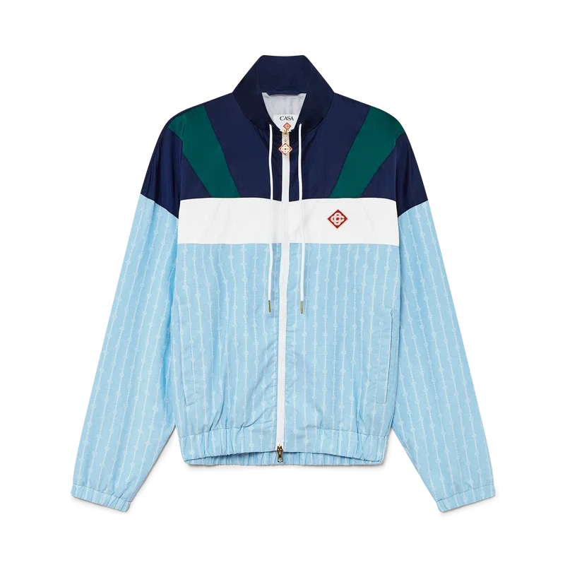 Nylon-treningsjakken med nålestriper er et sportsklærdesign laget av et teknisk stoff med husets karakteristiske diamantlogo. Utstyrt med glidelåslukking, marineblå, grønne og hvite paneler på skuldrene og brystet, en polo-hals med snøring, vertikale paspolerte lommer, et regnbeskyttelses- og ventilasjonspanel, samt elastisk kant og mansjetter.