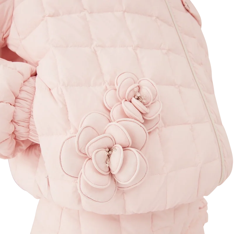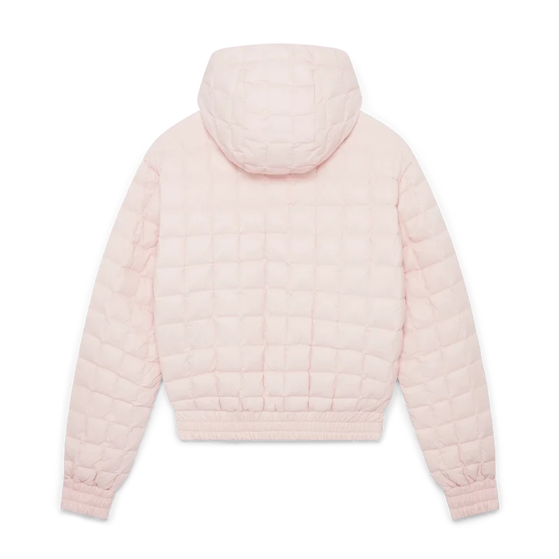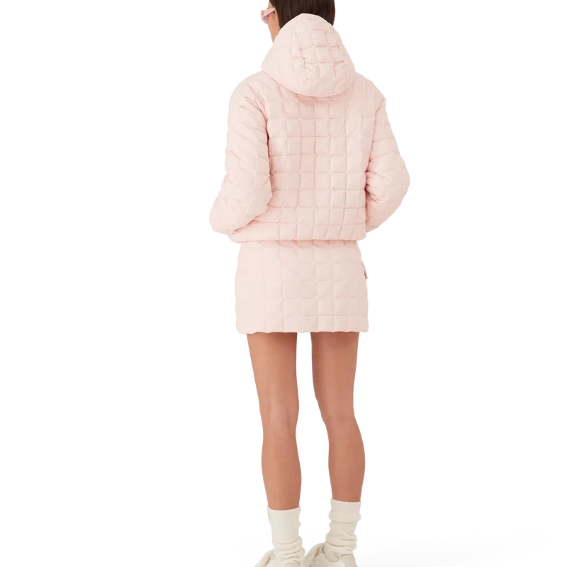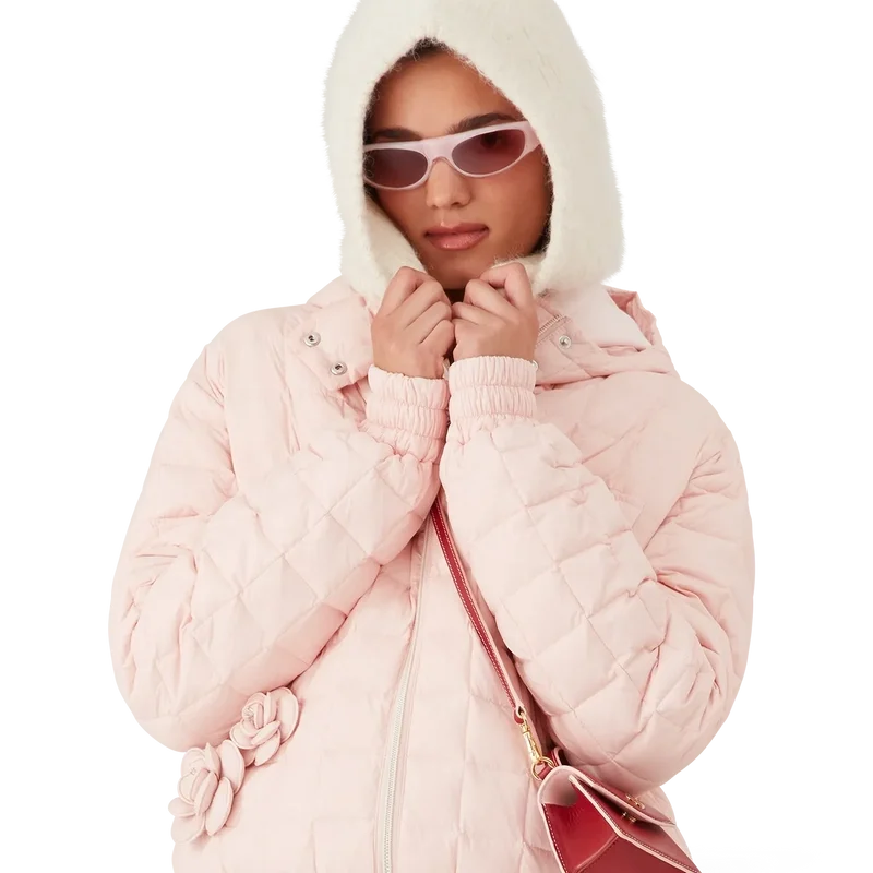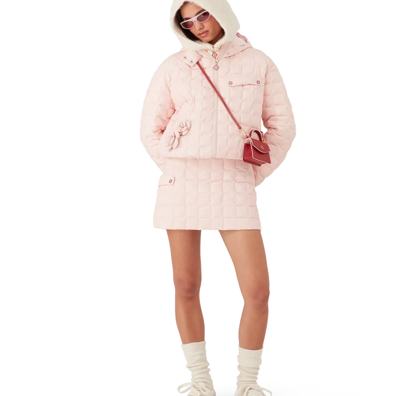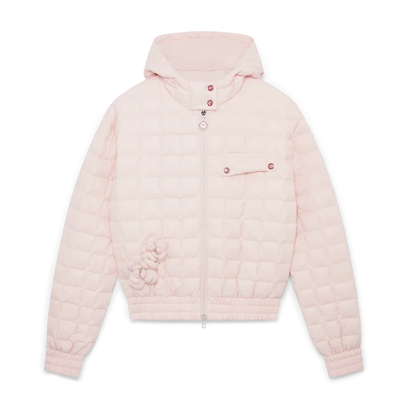 Den vatterte nylonjakken med hette er en langermet modell med et firkantet vattermønster. Den har hette, glidelåslukking, en lomme med klaff med husets sammenflettede, gullbelagte, emaljerte trykknapper med flat skaft, samt elastiske mansjetter og nederkant.