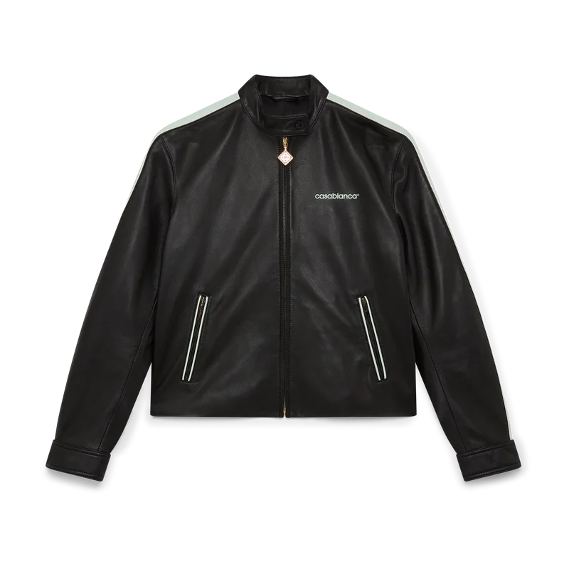 Lærjakken er et sportsplagg i slim fit, laget av lamme-nappa. Den har glidelåslukking, skrå frontlommer med glidelåslukking, striper nedover ermene og merkevarens Casablanca-logo.
