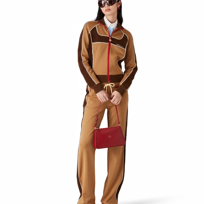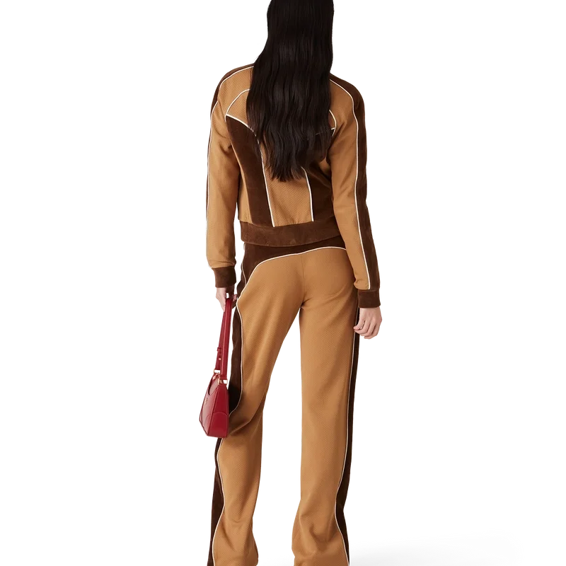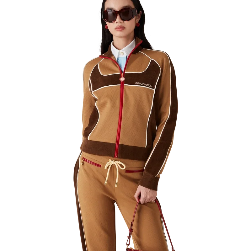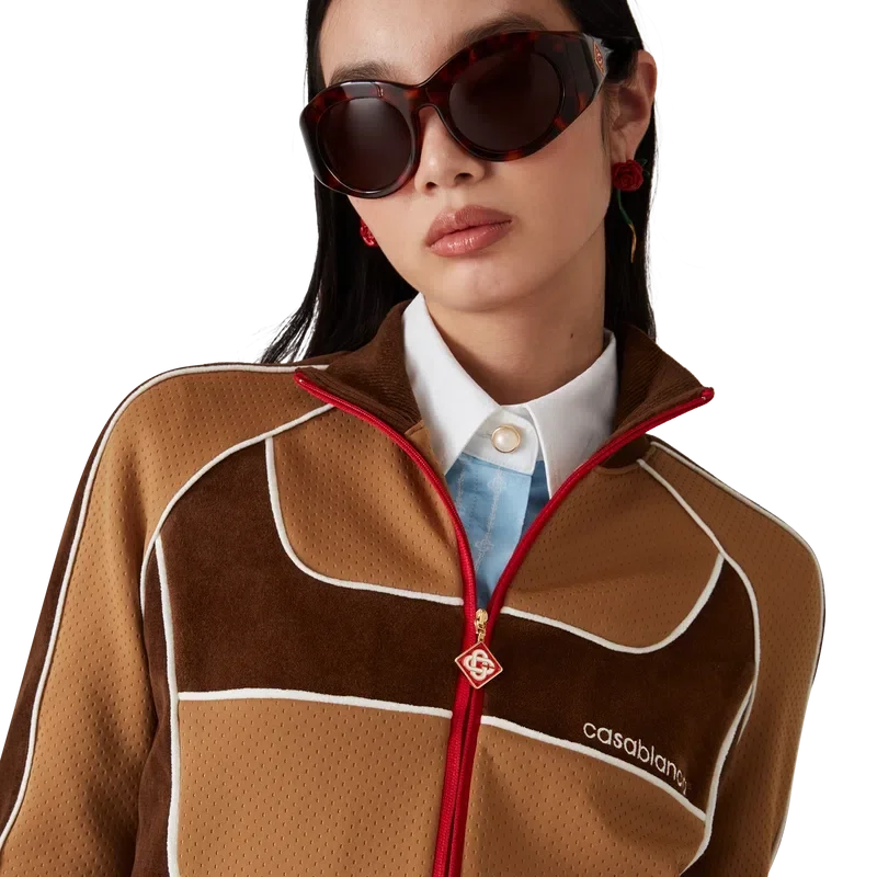 Chenille-jakken med paneler er et sportsinspirert design laget av teknisk velourstoff og har husets karakteristiske diamantlogo på glidelåstappen. Fullført med glidelåslukking, paneler med hvite pipingdetaljer og ribbestrikk i krage, mansjetter og nederkant.