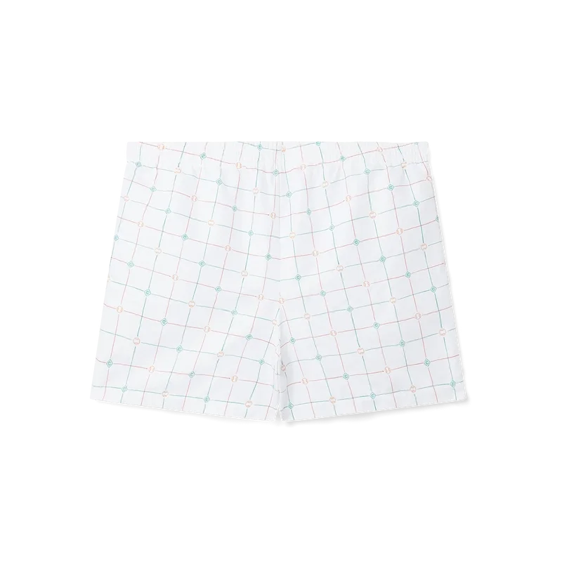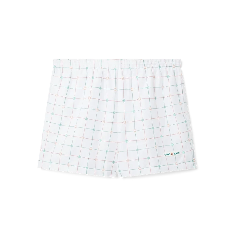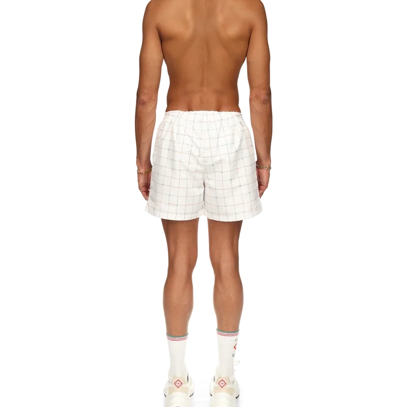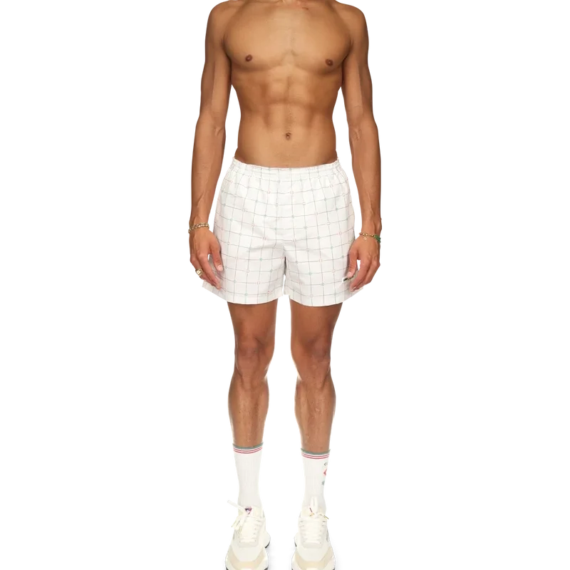Badeshortsen med tennisrutemønster er laget av teknisk polyesterstoff med et oransje og grønt rutemønster fra Casablanca Paris. Utstyrt med elastisk linning, snøring og sidelommer.