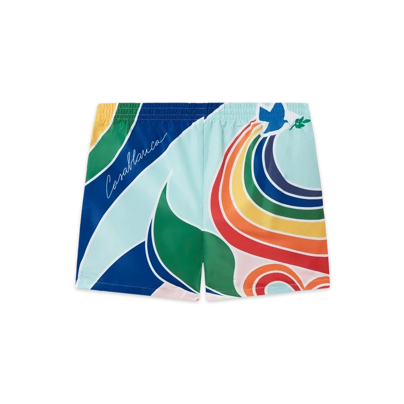 Le Pouvoir Des Fleurs-badebuksene er et sommermust laget av teknisk polyesterstoff med sesongbetont kunstverk som inkorporerer Casablanca-symbolikk med arabisk ikonografi. Utstyrt med elastisk linning, snøring og sidelommer.