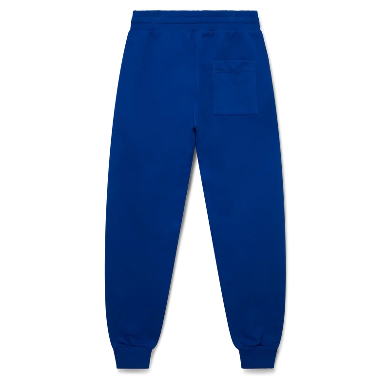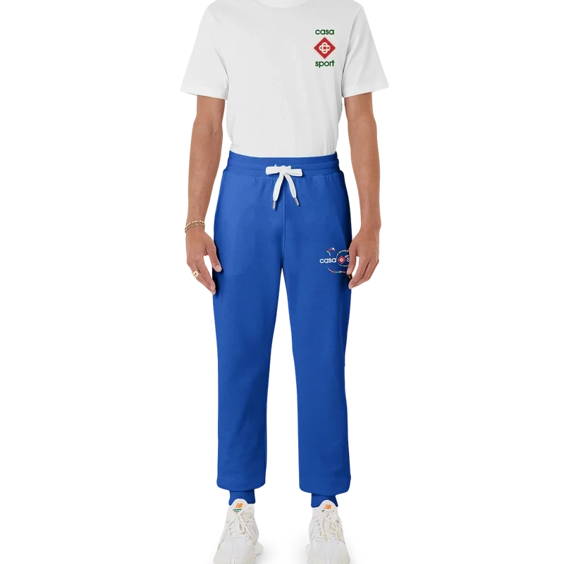 Drapeau De Collombes joggebukse i økologisk bomull i blått har sesongens kunstverk som inkorporerer husets signatur Casa Sport-ikonografi. Fullført med snøring med gullspisser, elastiske mansjetter, sidelommer og Casablanca Paris-merkelapp, designet for en klassisk passform.
