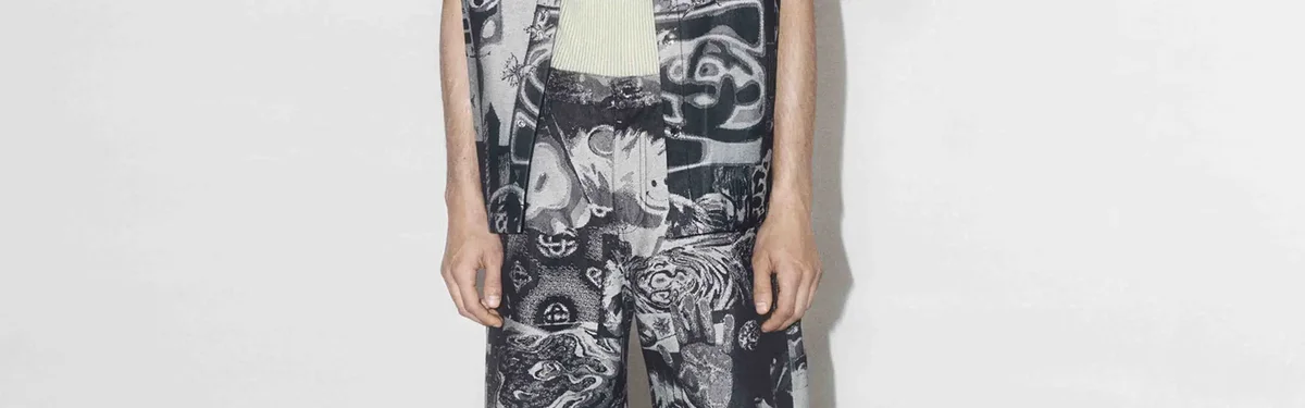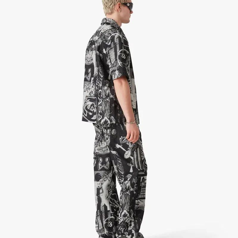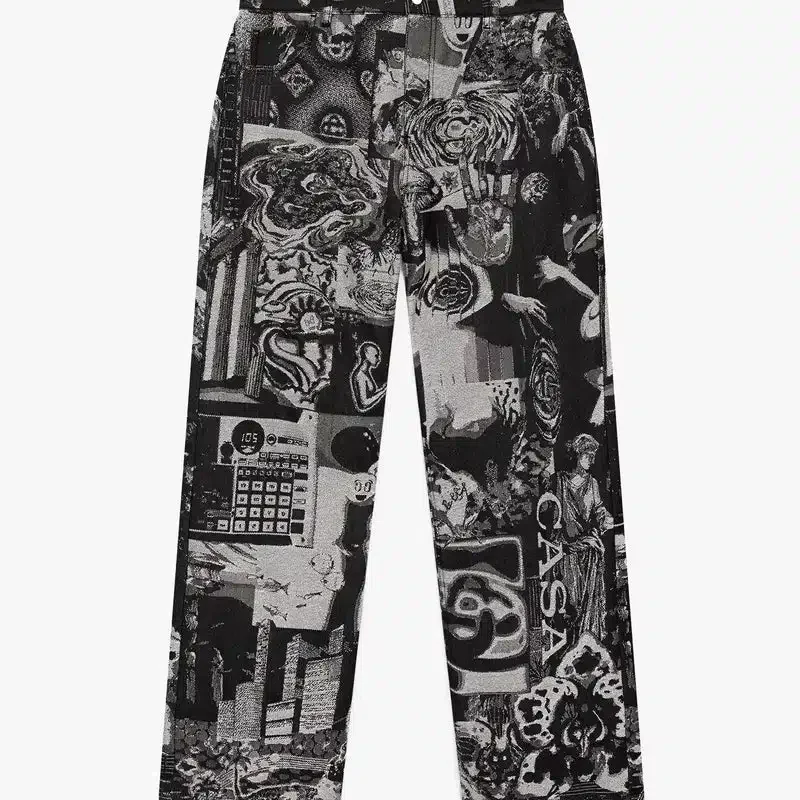 Rave Collage Straight Leg Jeans har et raffinert design med sesongens kunstverk som tolker en rotete samling av rave-flyers og ikonografi, overført til en kornete tekstur gjennom en jacquard-denimvev. Fullført med beltestropper, glidelåslukking, lommer foran og bak, fôr og sølvbelagte detaljer.