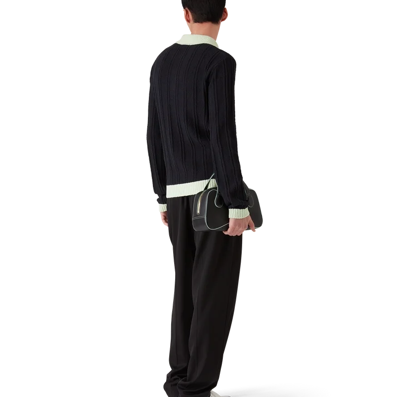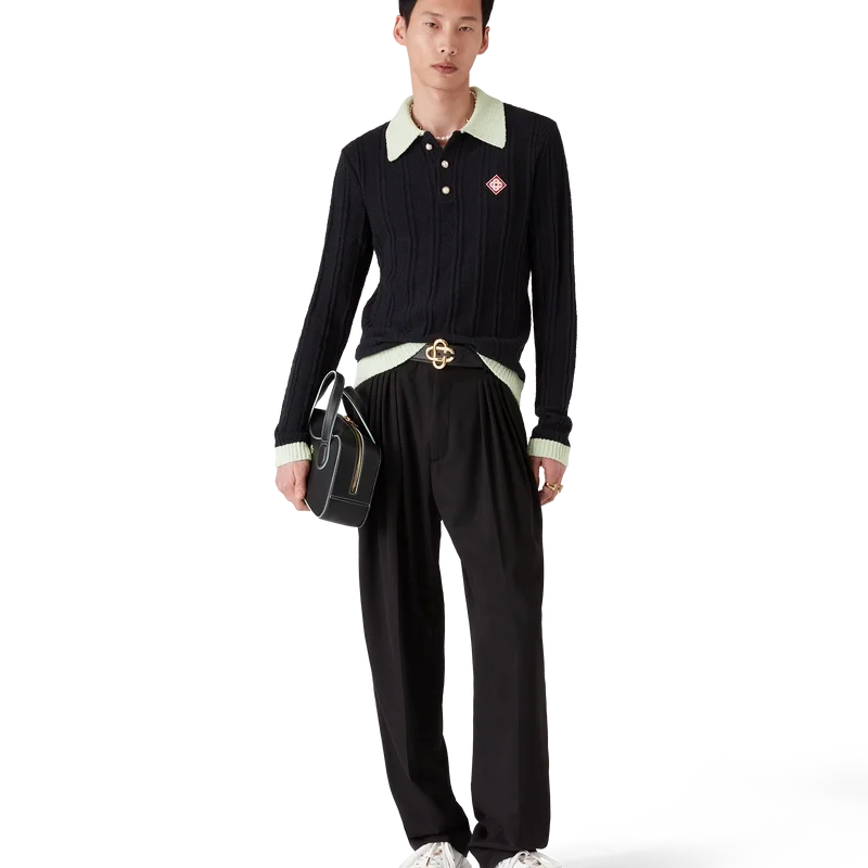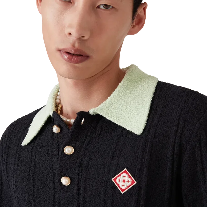 Boucle-pique-skjorte med lange ermer er en langermet modell laget av et bomullsboucle-stoff. Den har knappestenging, kontrastfarget ribbestrikket krage, mansjetter og nederkant.