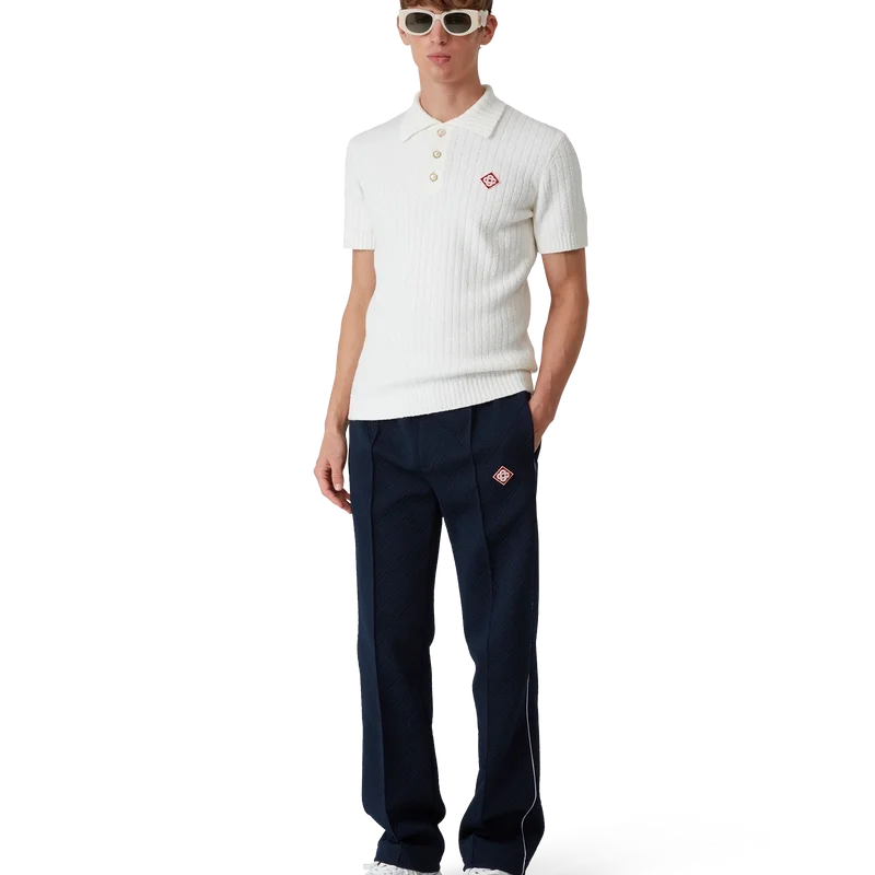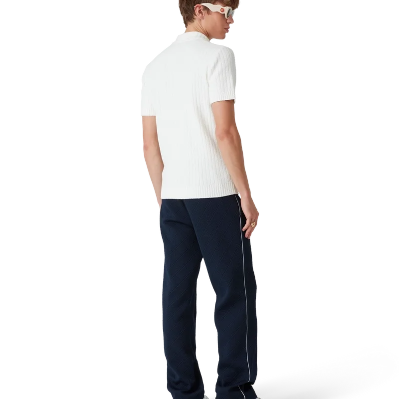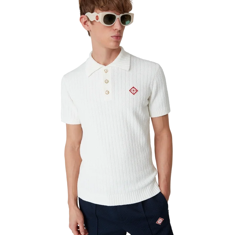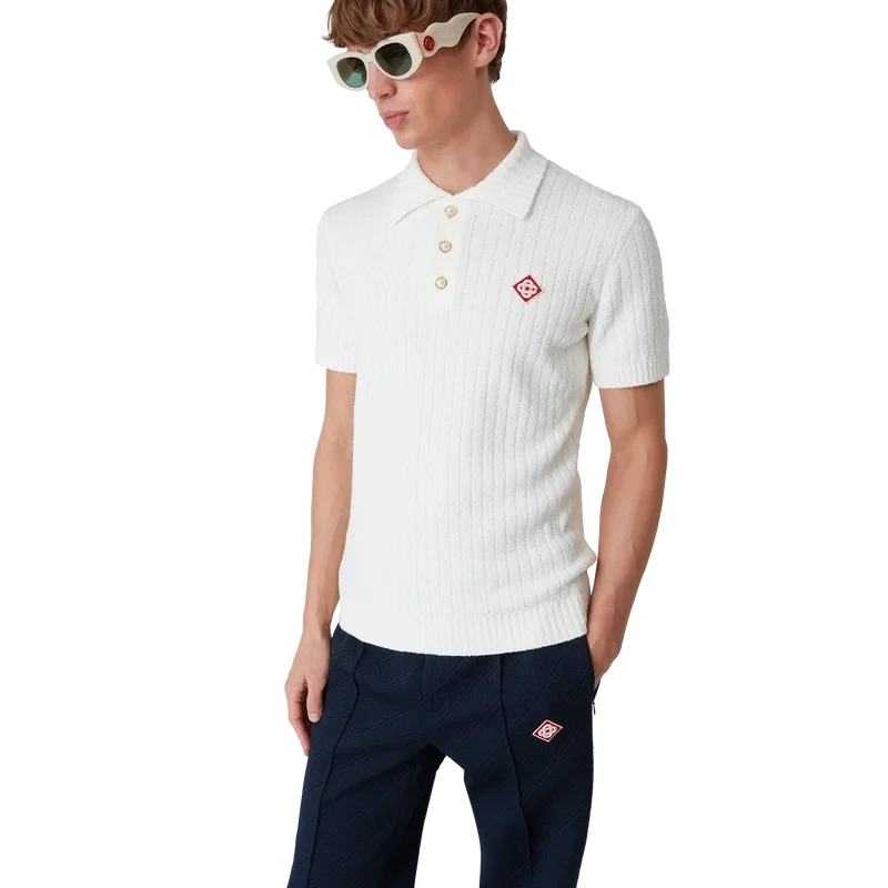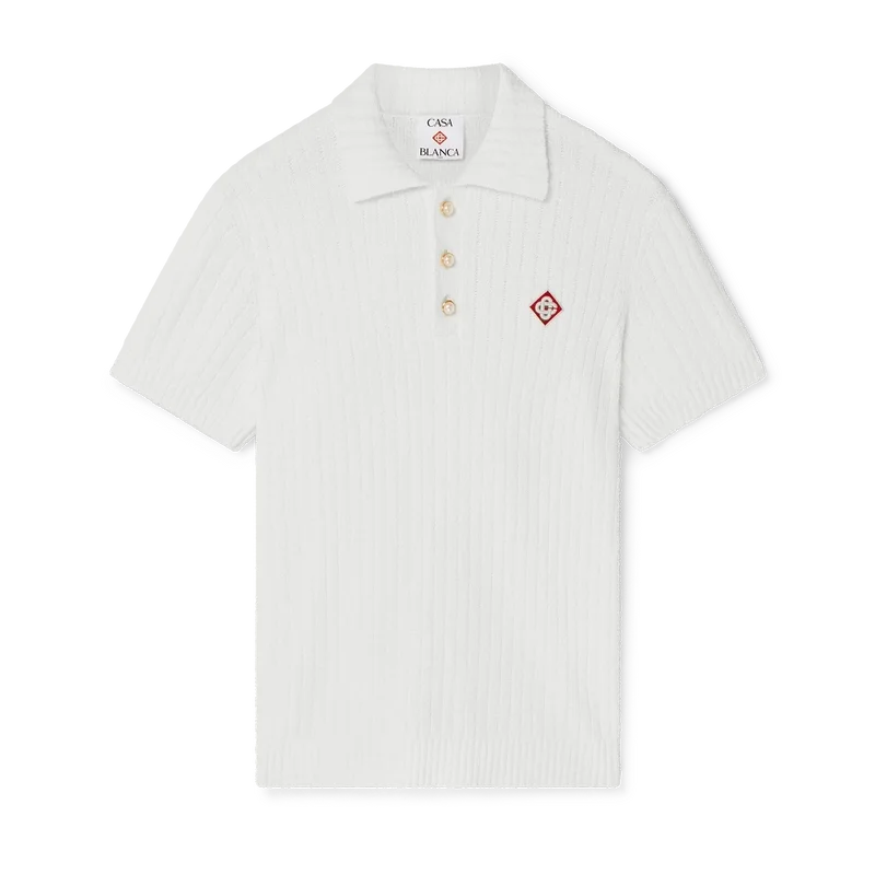 Boucle-pique-skjorten har et mykt strukturert design laget av et bomullsblandingsstoff med diskrete ribbedetaljer og husets karakteristiske diamantlogo. Fullført med ribbet krage, mansjetter, nederkant og karakteristiske gullkantede perleknapper.
