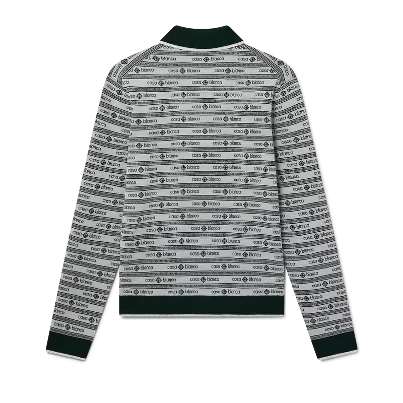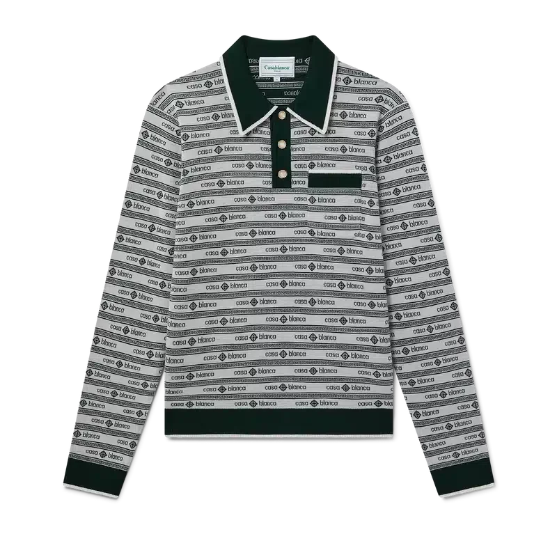 Evergreen Logo Pique-skjorte er en langermet pique-skjorte med husets Casablanca-logo, laget av merinoull. Den har karakteristiske gullkantede perleknapper, brystlomme og kontraststrikk med hvite kanter på krage, mansjetter, nederkant, knappeliste og lomme.