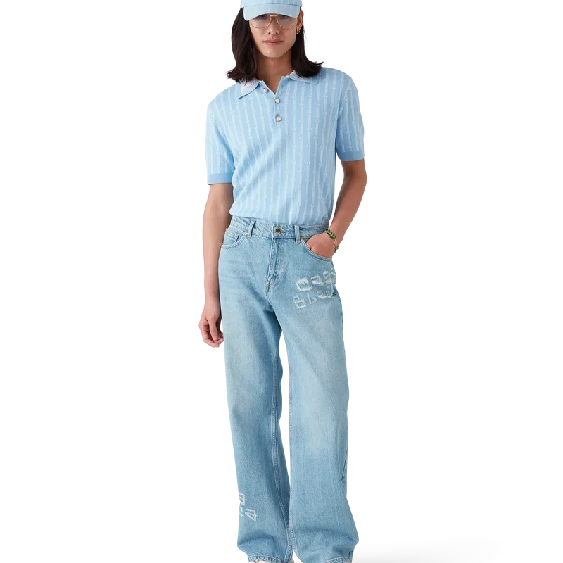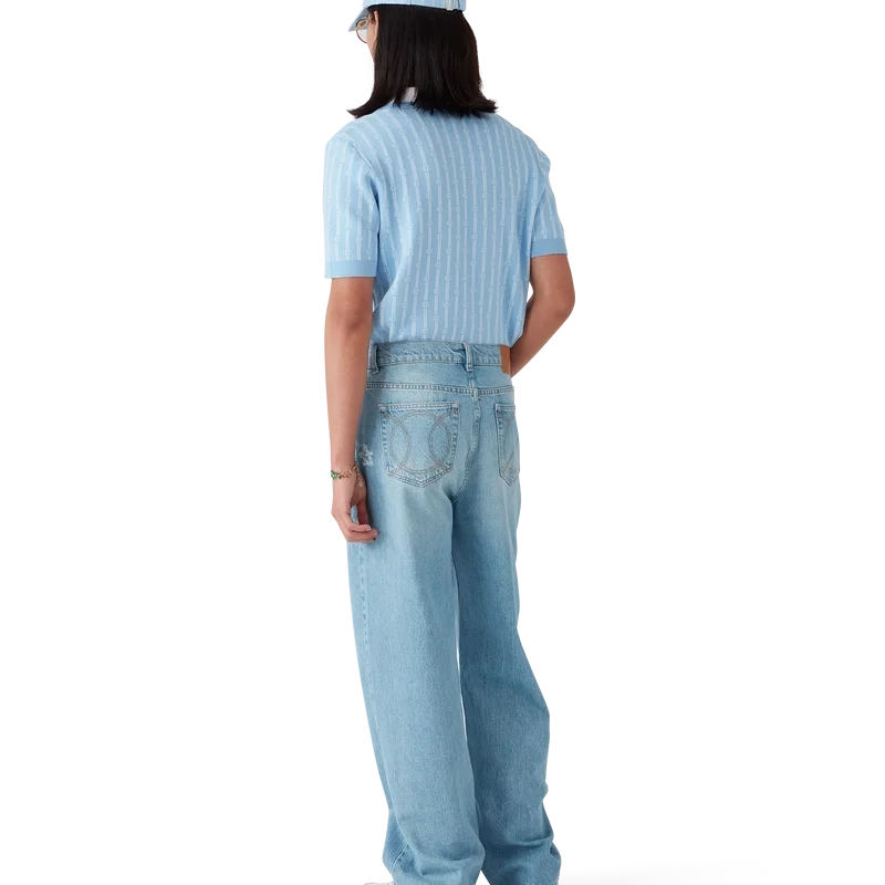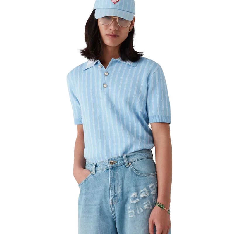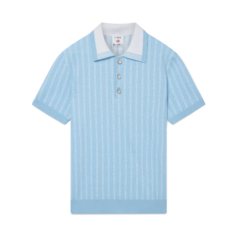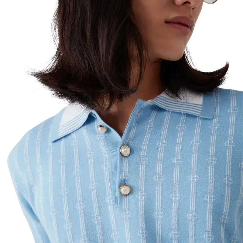Monogram-pique-skjorten er en kortærmet modell laget av en bomullsblanding med en klassisk knappeliste med tre knapper. Fullført med husets karakteristiske gullkantede perleknapper, ribbede mansjetter, kant og krage med kantdetaljer.