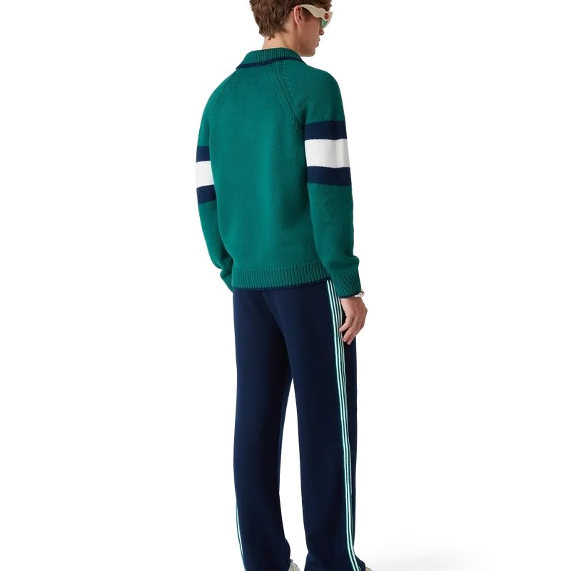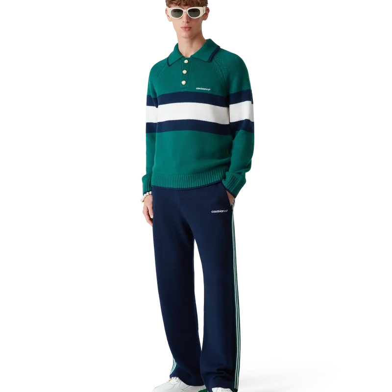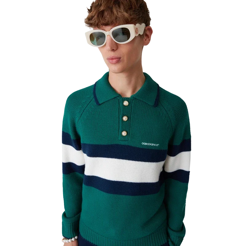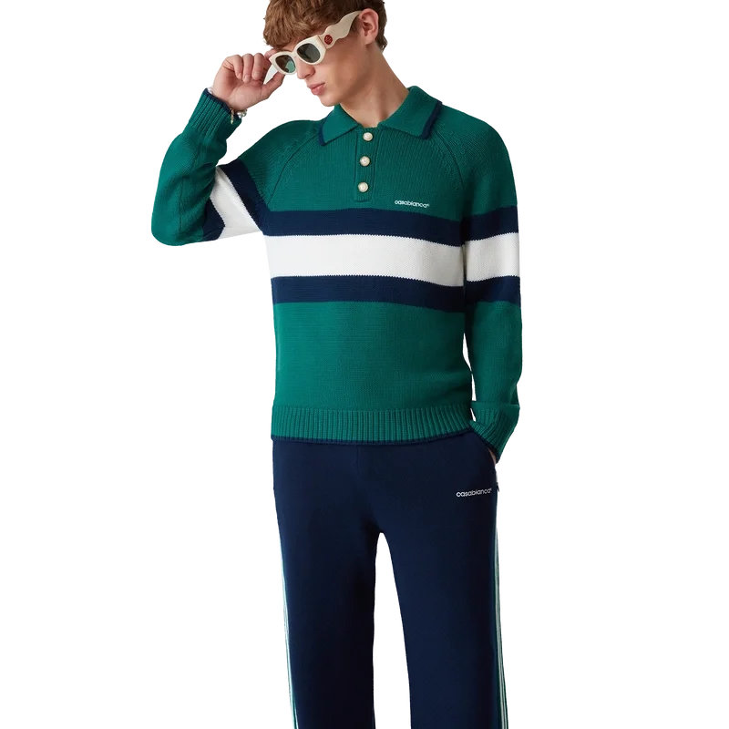Pique-skjorten med fargeblokker er en langermet modell laget av merinoullstoff og har en blå og hvit stripe over brystet og ryggen. Den har raglanermer, ribbede mansjetter, kant og krage, karakteristiske gullkantede perleknapper og Casablanca-logo.