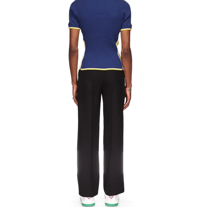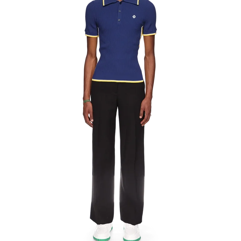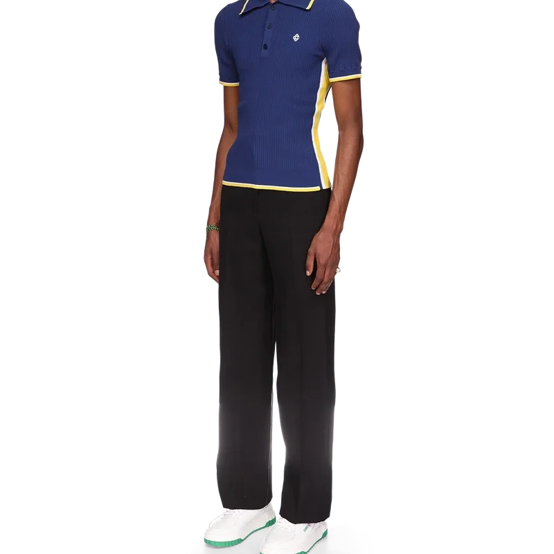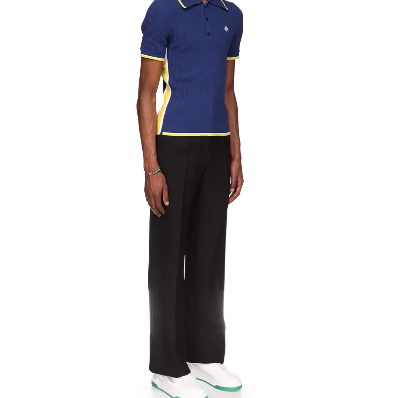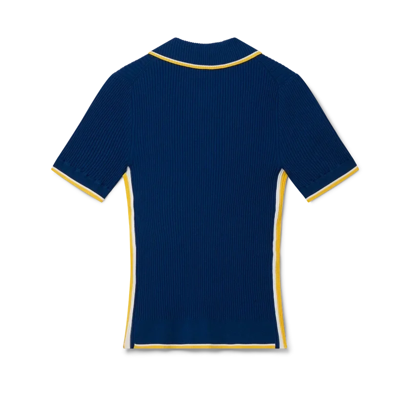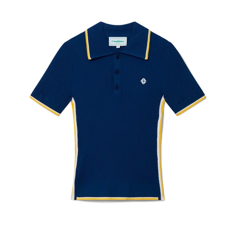 Den ribbestrikkede pique-skjorten er laget av et ribbestrikket stoff i viskoseblanding. Den har kontrastdetaljer på krage, mansjetter og nederkant, gule og hvite striper nedover sidene, husets sammenflettede Cc-logo-knapper og et brodert Cc-logo på brystet.