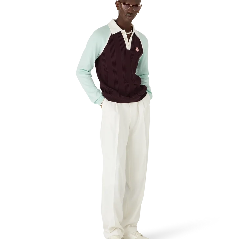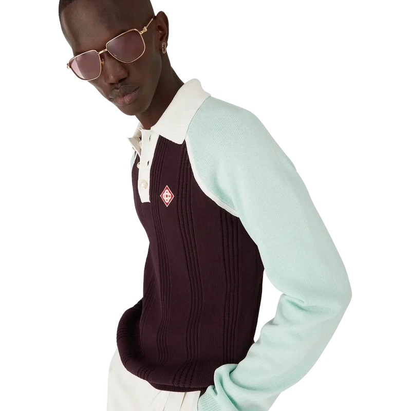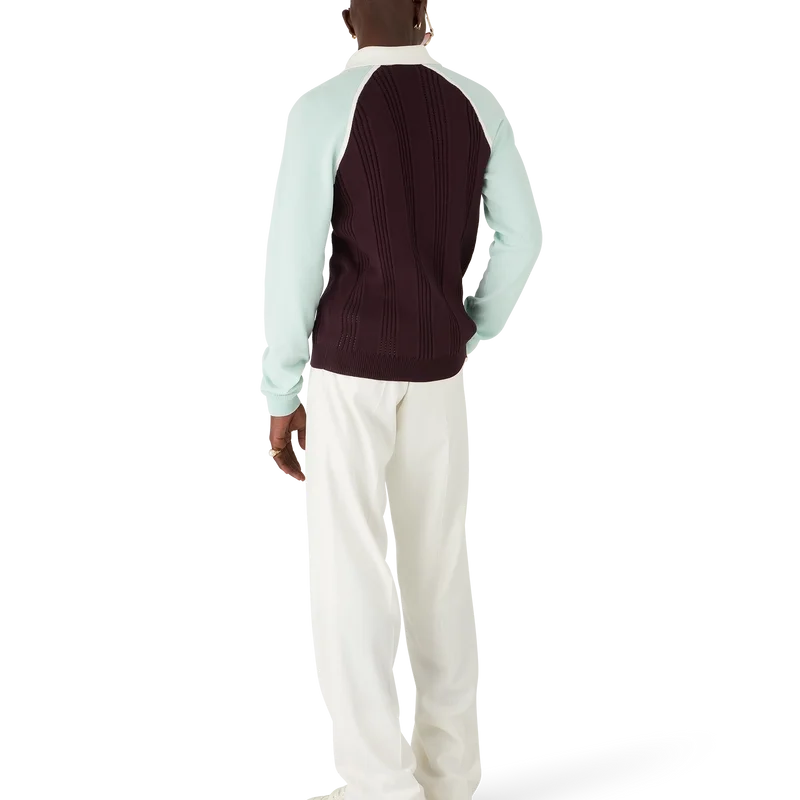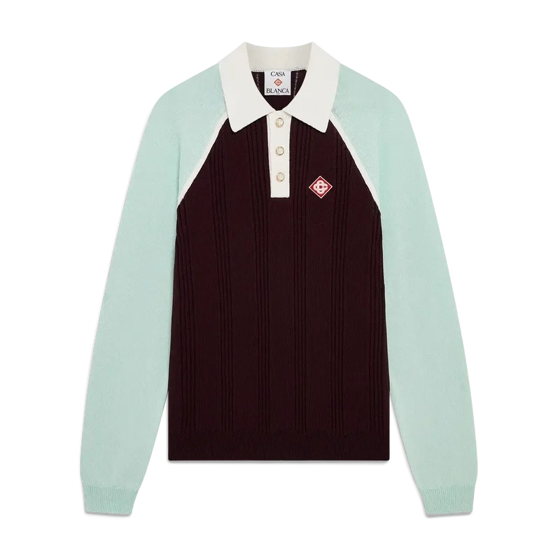 Tennis langermet pique-skjorte er et strikket design laget av bomull, med husets karakteristiske diamantlogo-lapp. Fullført med hvit ribbkrage og knappelukking, mintfargede raglanermer og karakteristiske gullkantede perleknapper.