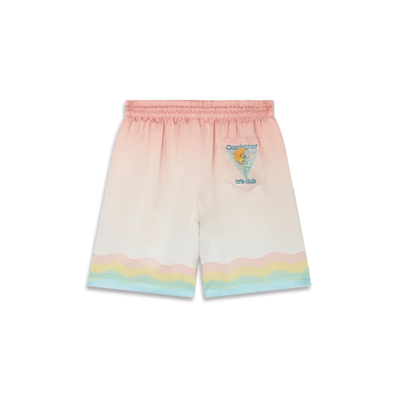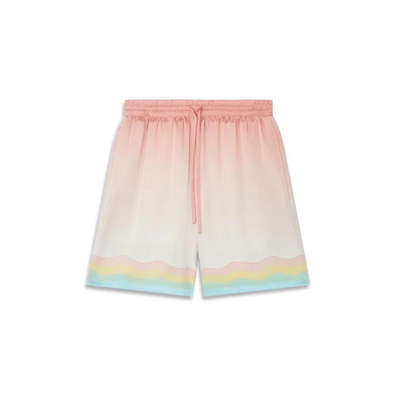 Arts Club silke-shorts i rosa ombre-farge med sesongens kunstverk. Utstyrt med elastisk linning, snøring og lommer på siden og bak, og faller løst til over kneet.
