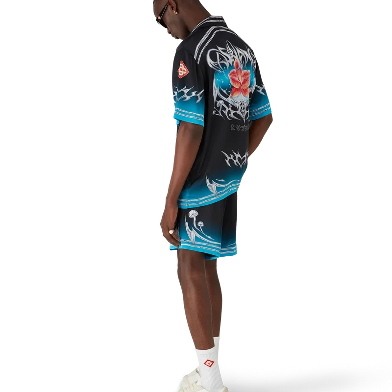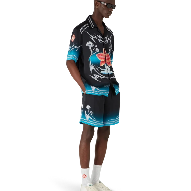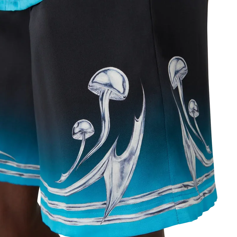 Blades Silk Satin Shorts har et trykt design med kunstverk som leker med kontrasten mellom to motstridende følelser – skarpheten til bladet og det kalde, sølvfargede kromet, i kontrast til naturens varme, som de dristige rosa og røde tonene i en orkideblomst. Tilsetningen av vann gir designet et friskt og sprøtt element. Komplett med elastisk linning, snøring, lommer i sømmen og en påsydd lomme bak.
