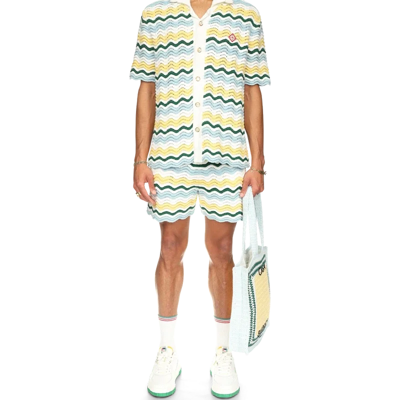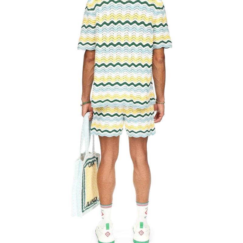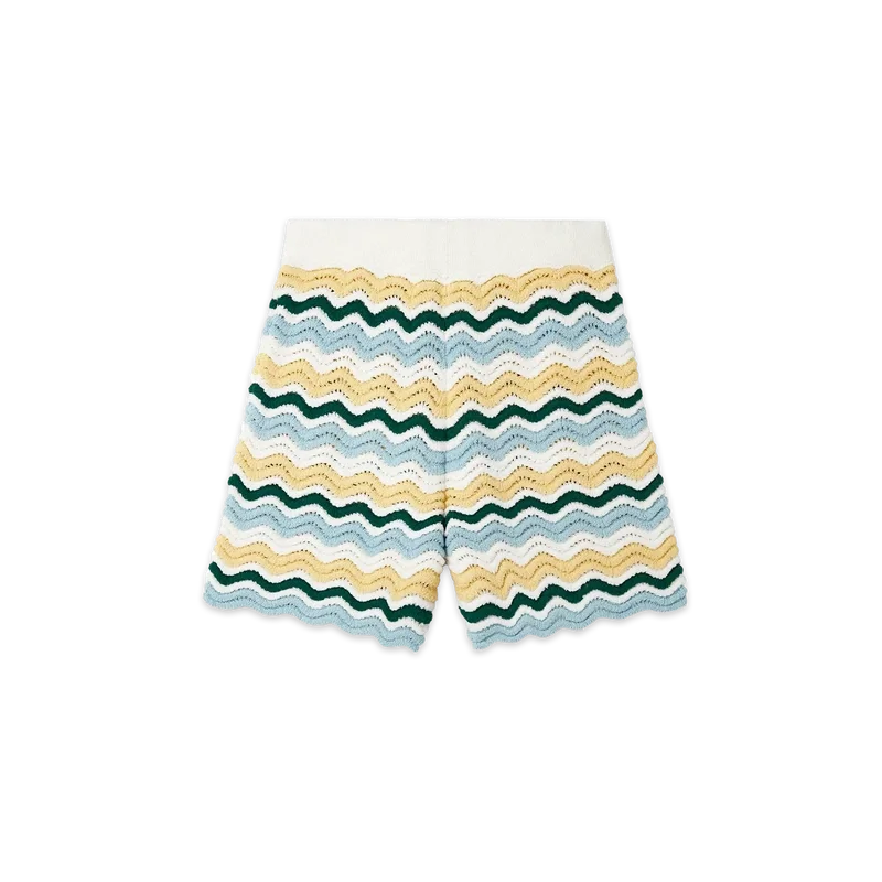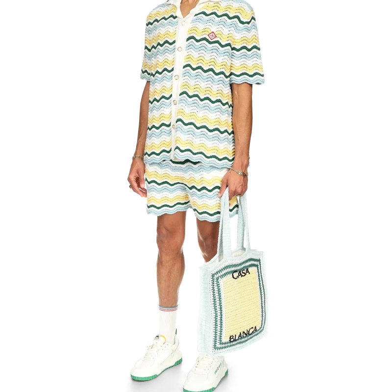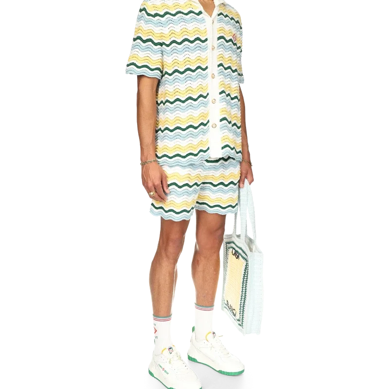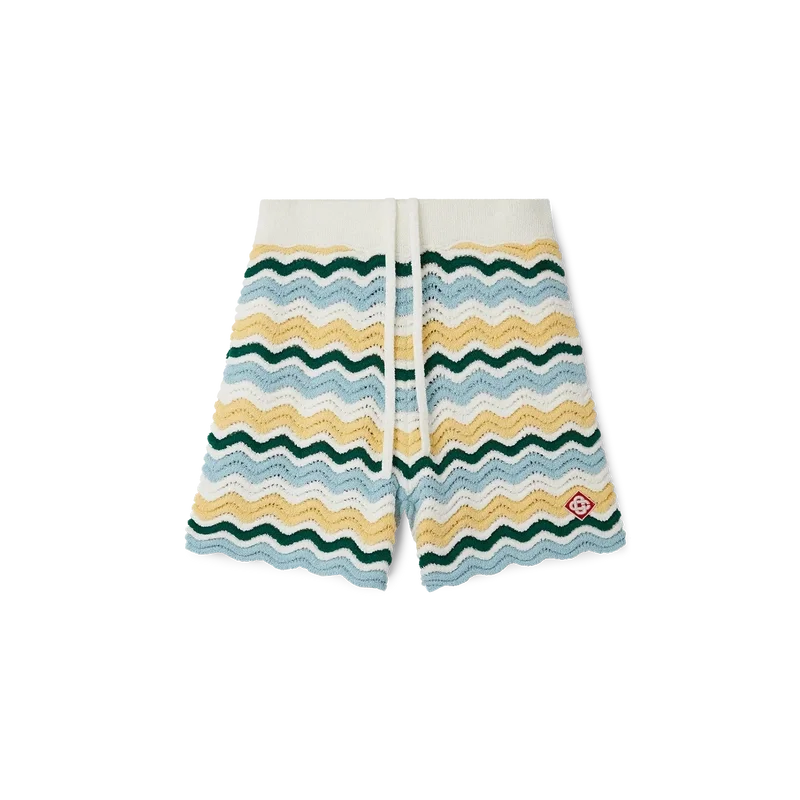 De bølgete bouclé-shortsen er et signaturdesign fra Casablanca, laget av et mykt, strukturert bouclé-stoff med åpen veving. Utstyrt med en innvendig snøring, husets diamantlogo og et Casablanca-merkelapp – designet for å brukes med klassiske passformer.
