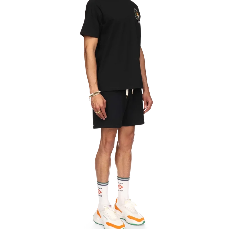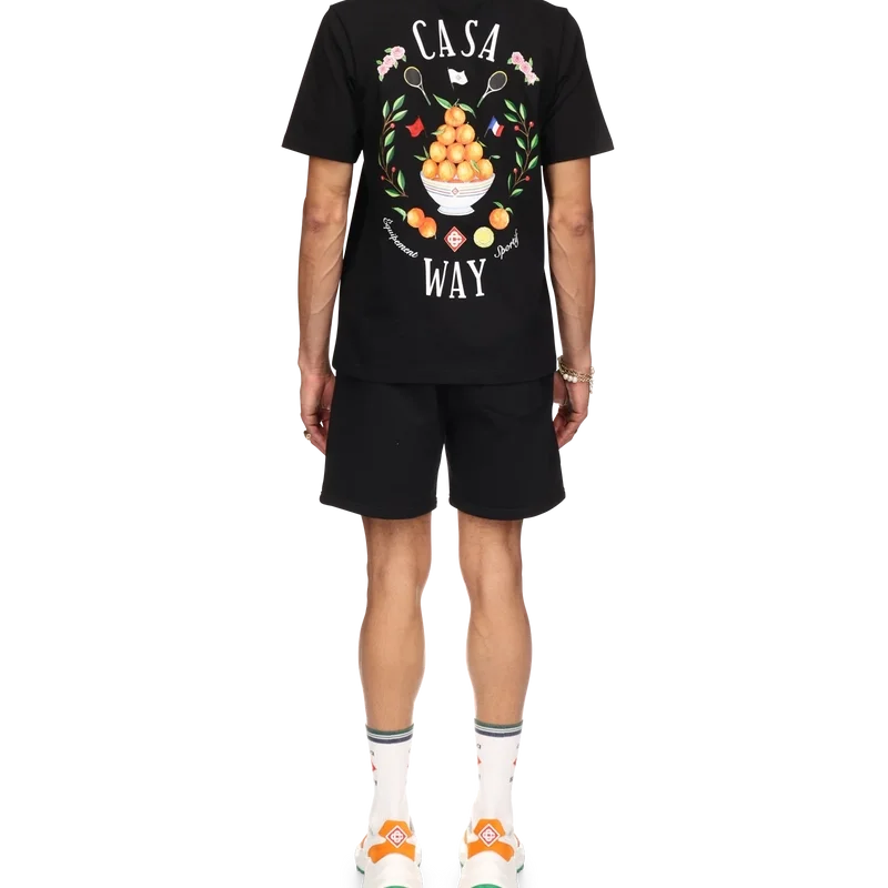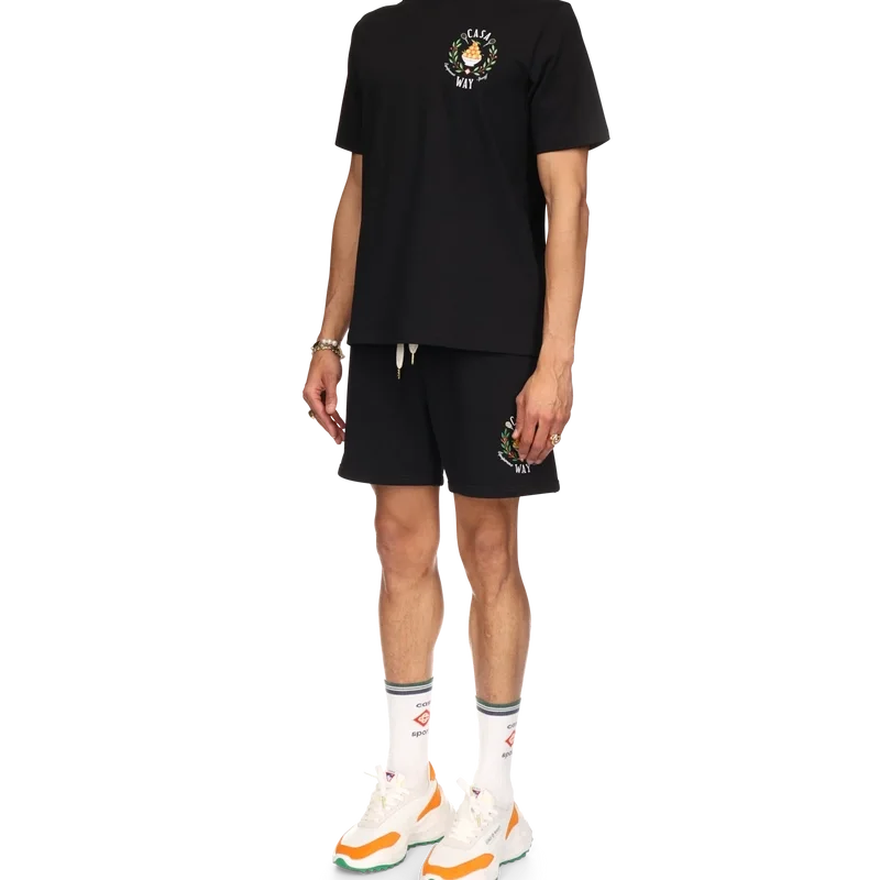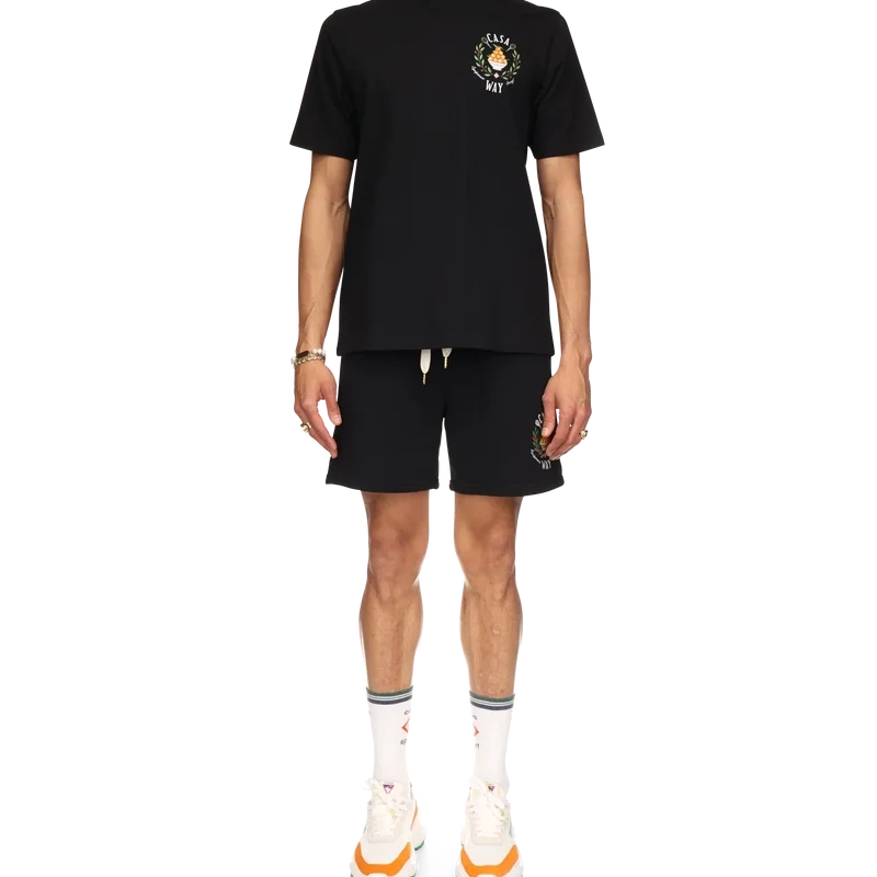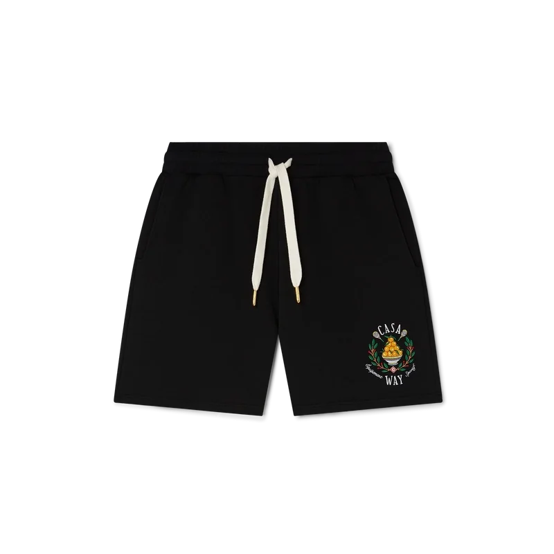 Casa Way-sweatshortsene er laget av økologisk bomull og har husets karakteristiske kunstverk med broderte illustrasjoner av sportsutstyr og blomsterdetaljer som er tolket på nytt for sesongen. De er utstyrt med snøring med gullspisser, skrå sidelommer og en baklomme.
