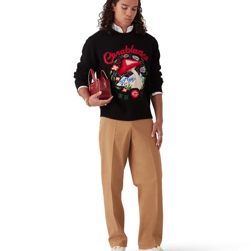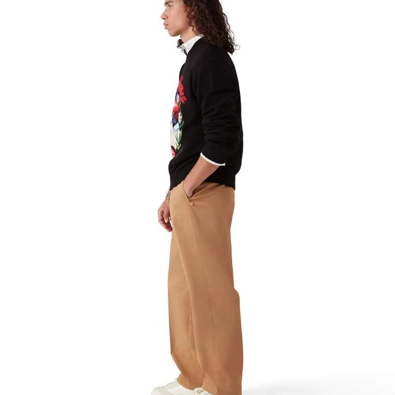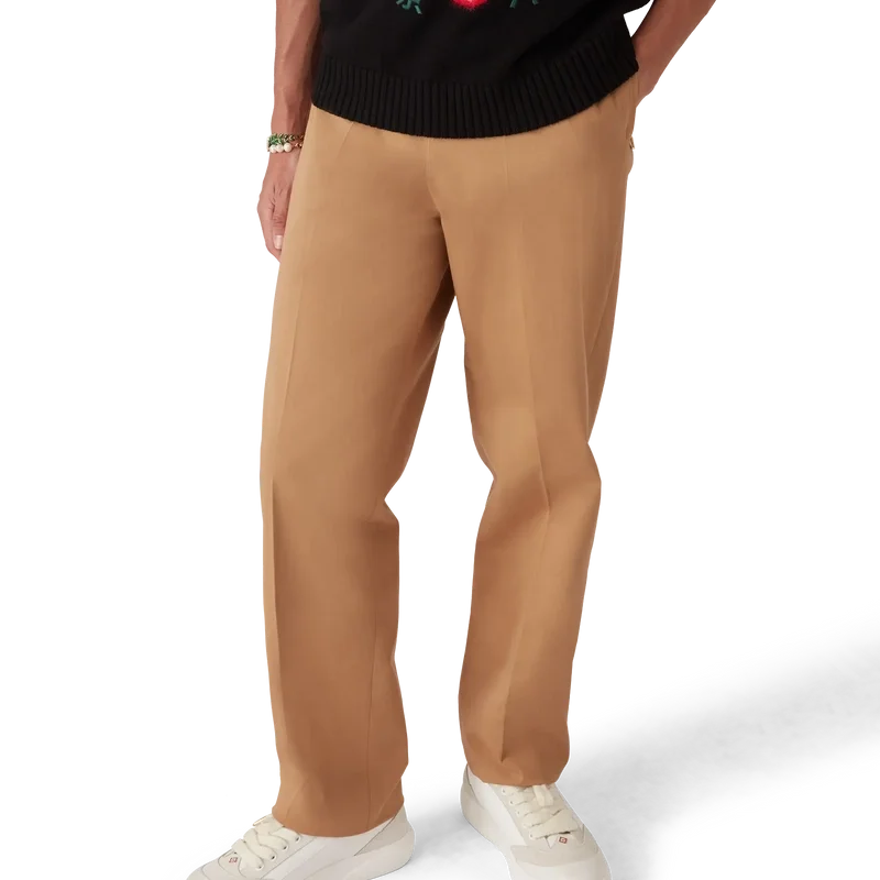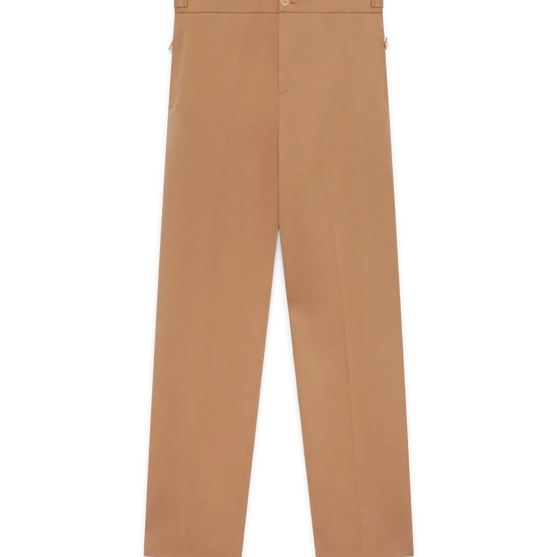 Chinobuksene har et rett ben og er laget av økologisk bomullsstoff. De har bomullsfôr, innvendige lommer med glidelås og husets karakteristiske diamantlogo på glidelåstappene, glidelås, justerbare stropper i sidene og baklommer med kant.