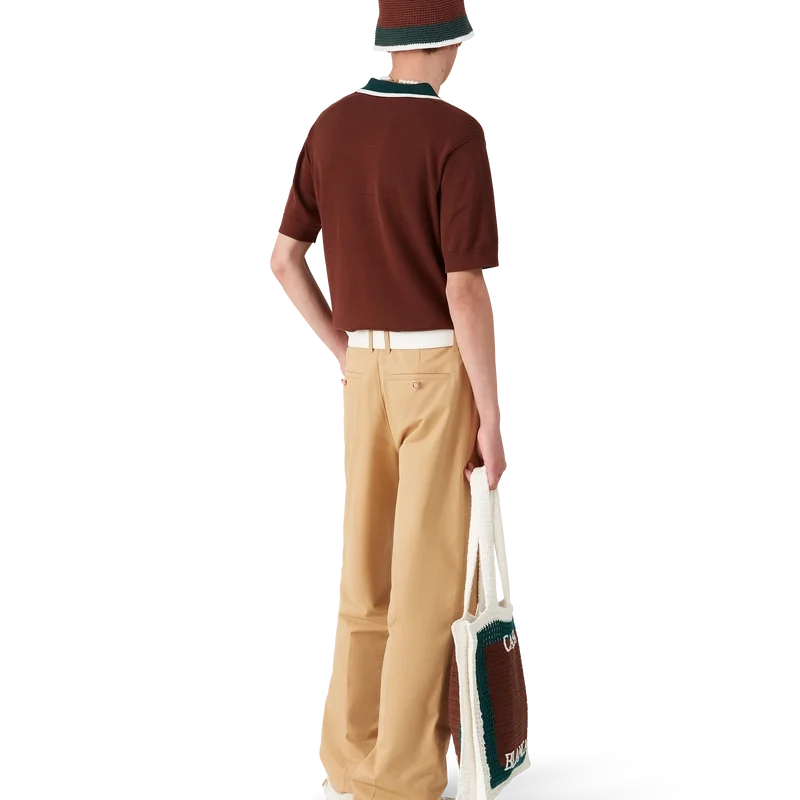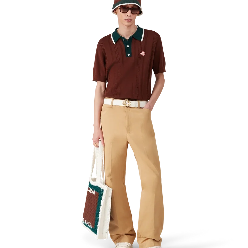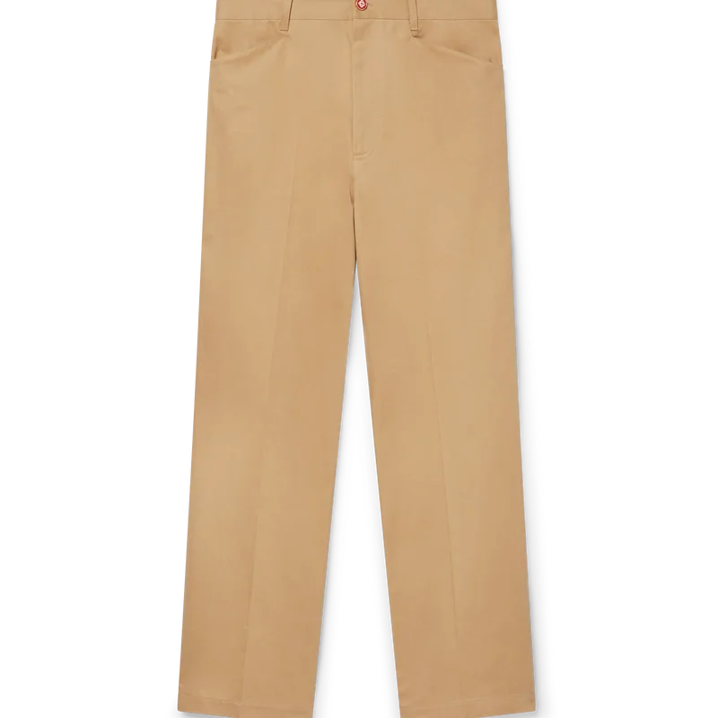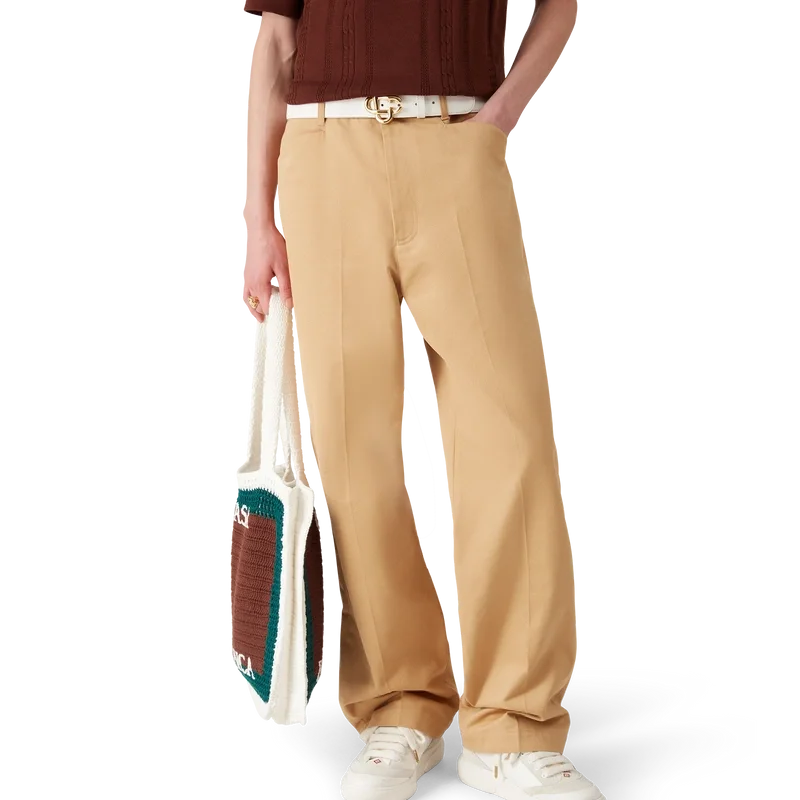 Bomulls-chino-buksene har et rett ben-design, er laget av bomullstwill og har bomullsfôr. De er utstyrt med beltestropper, glidelåslukking, lommer foran og baklommer med kant, samt lukking med emaljerte knapper med sammenflettet CC-logo og gullkant.