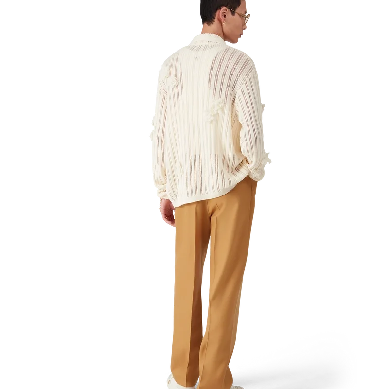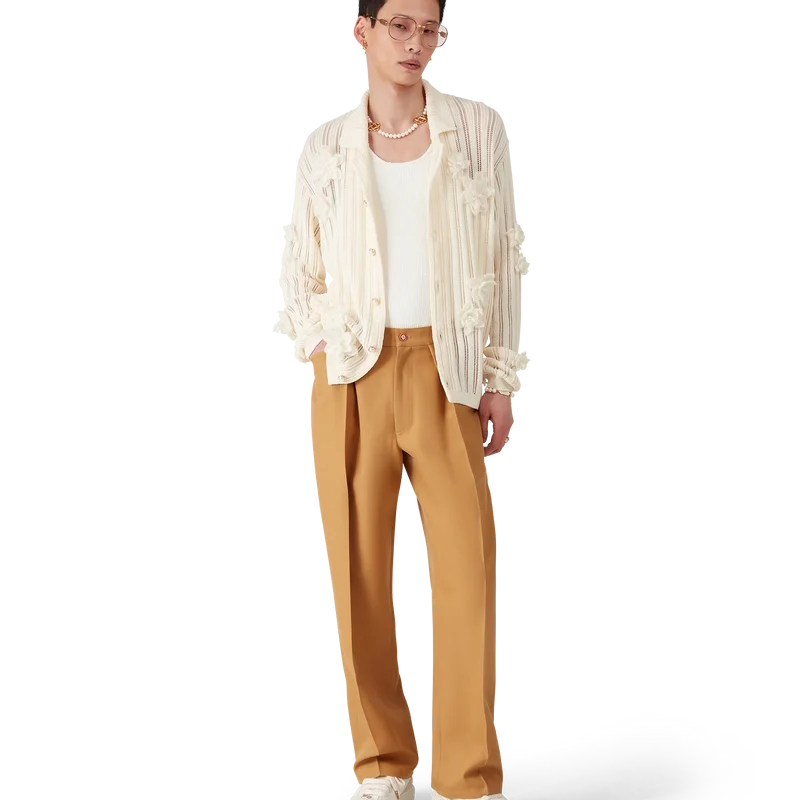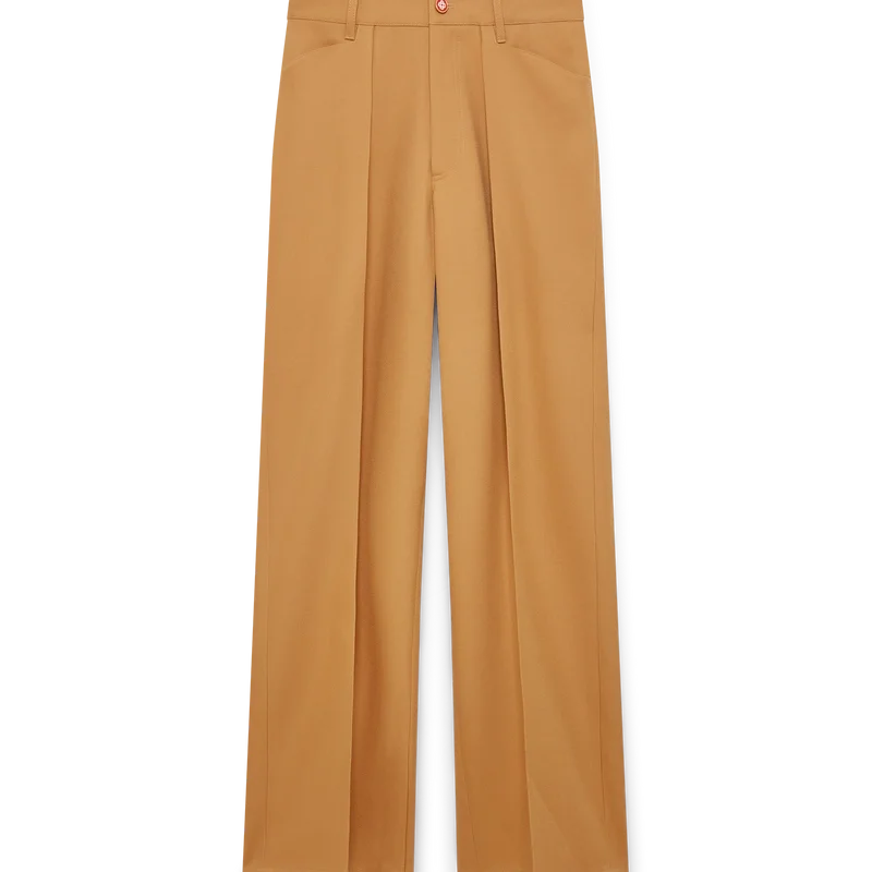 De plisserte chinoene har et konisk ben og er laget av ullstoff, med fôr i bomullsblanding. Utstyrt med beltestropper, glidelås, frontlommer, diagonale plisseringer og baklommer med kantbånd og emaljeknapper med sammenflettet CC-logo og gullkant.<!–