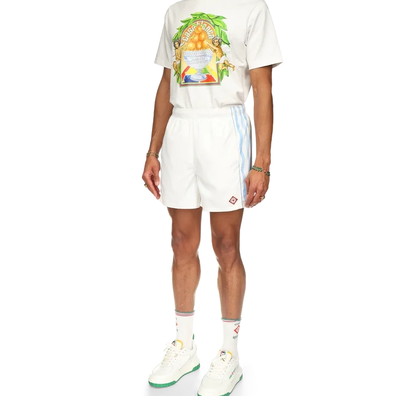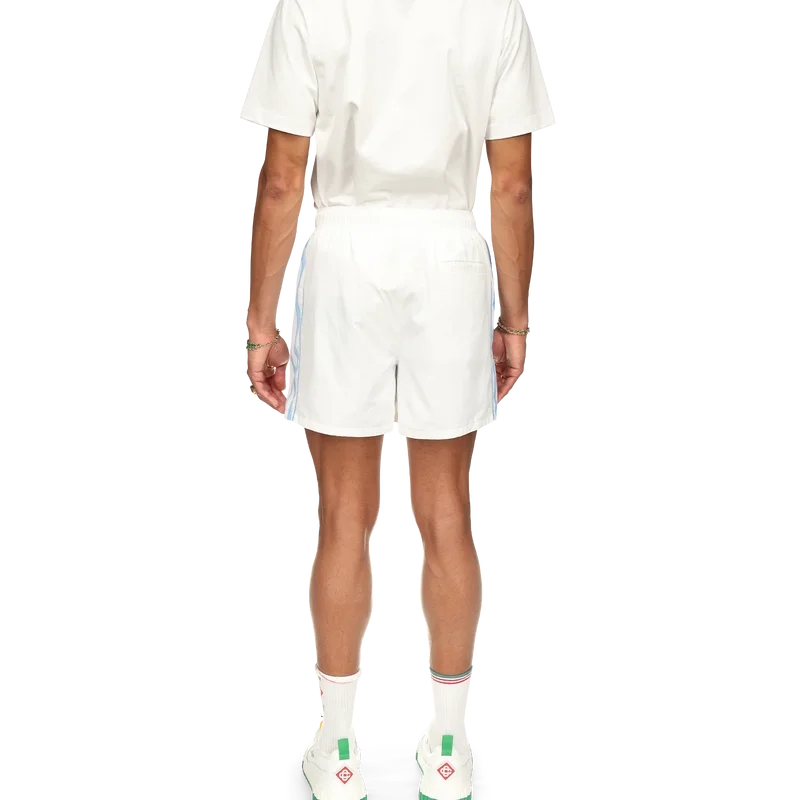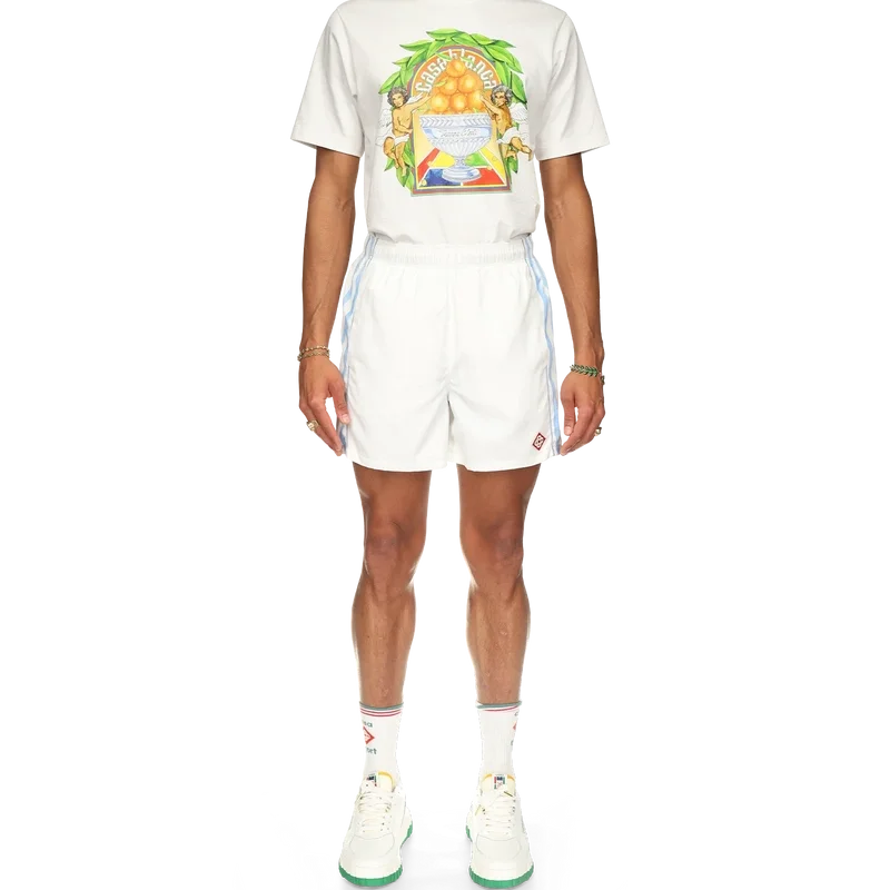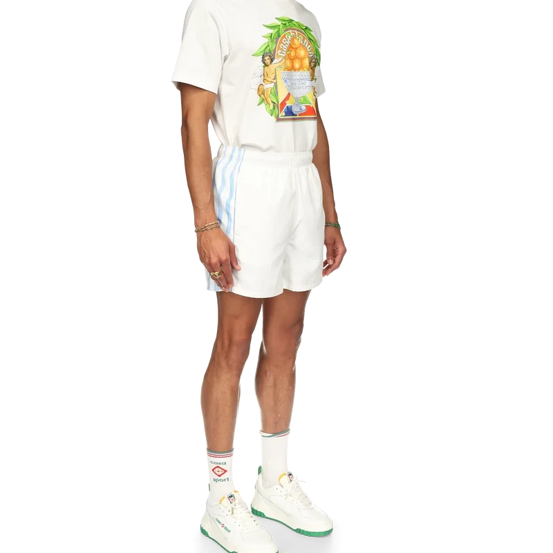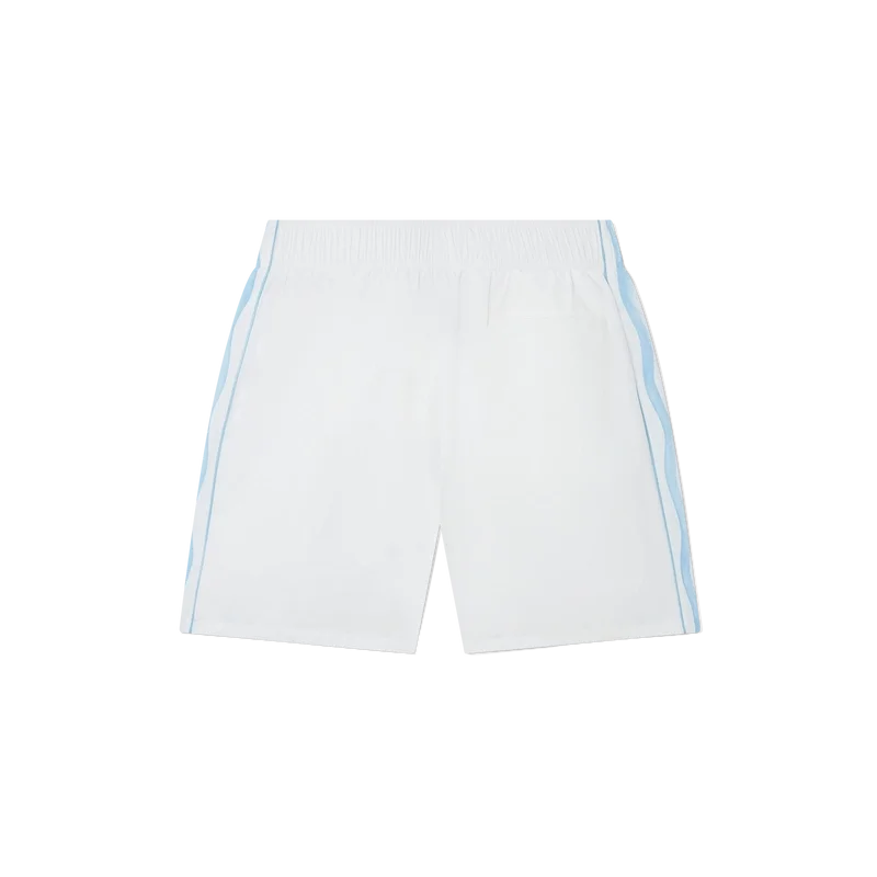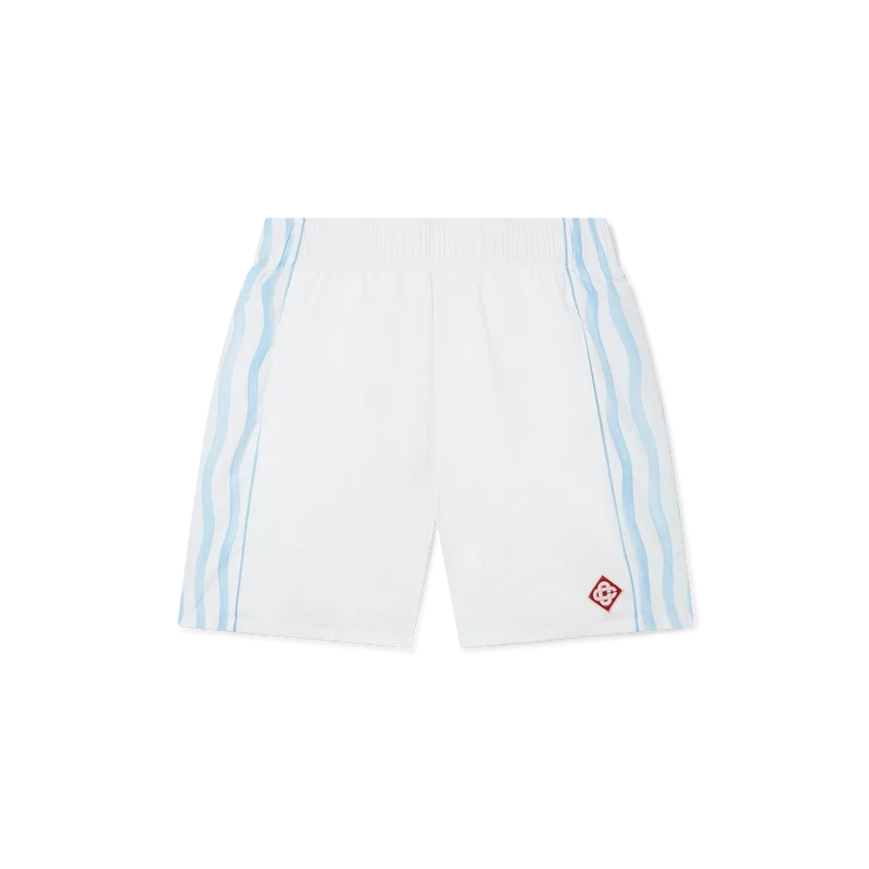 Equipement Sportif-treningsshortsen er laget og fôret med 100 % polyester og har blå og hvite bølgestripete sidepaneler. Utstyrt med lommer foran og en baklomme, elastisk linning, husets diamantlogo og Casablanca-merkelapp.