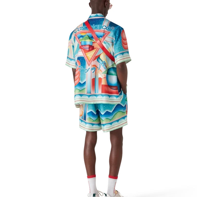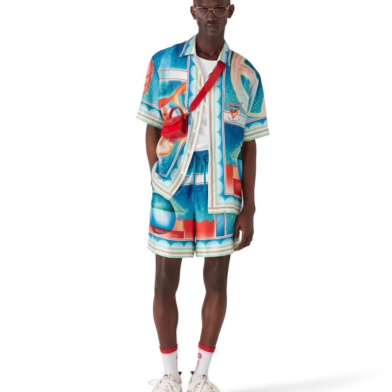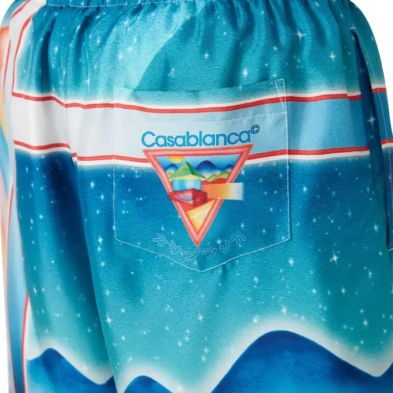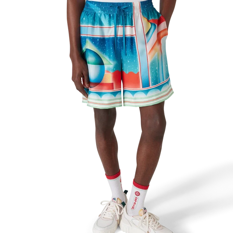 Galaxy Court-silkeshortsene har et heltrykt mønster og er laget av silketwill. De har elastisk linning, snøring, fôr, sidelommer i sømmen og en baklomme.