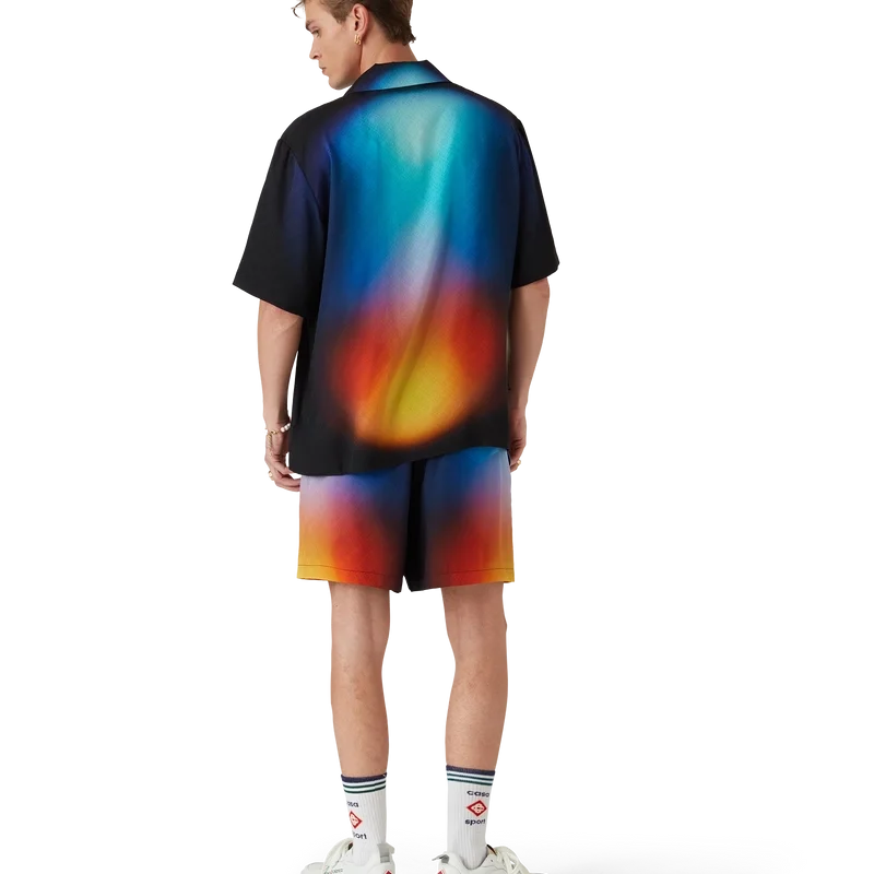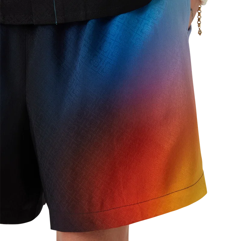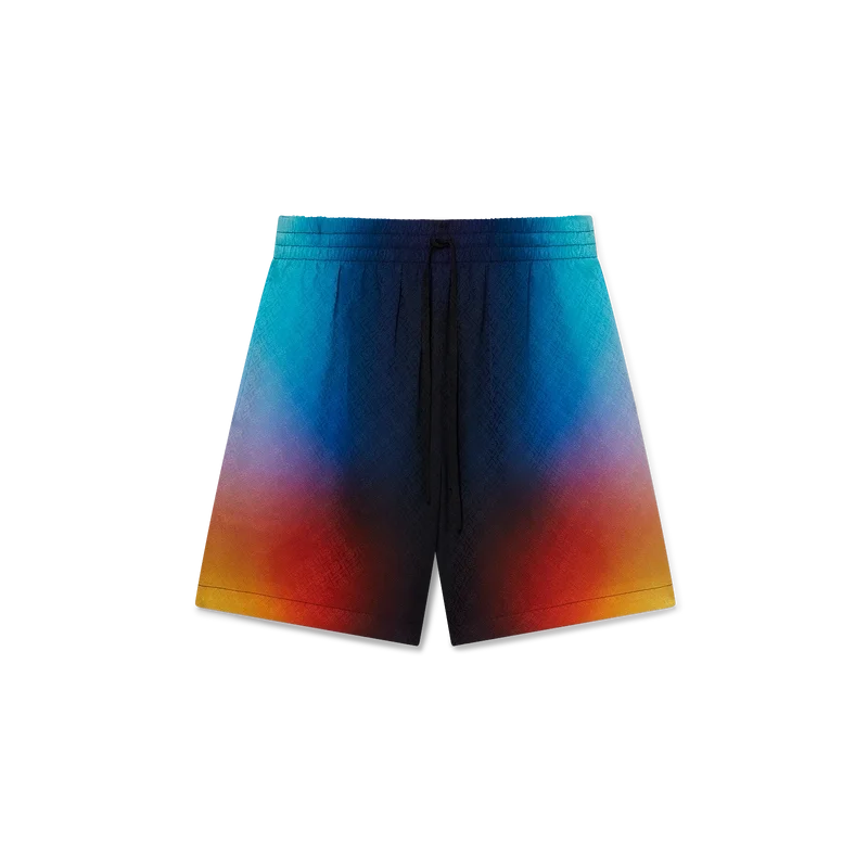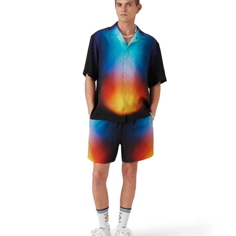 Gradient Silk Shorts er et trykt design med sesongens gradientfarger, laget av silke. Utstyrt med elastisk linning, snøring, sidelommer i sømmen og en påsydd baklomme. Designet for å brukes sammen med den matchende Gradient Silk Skjorte.