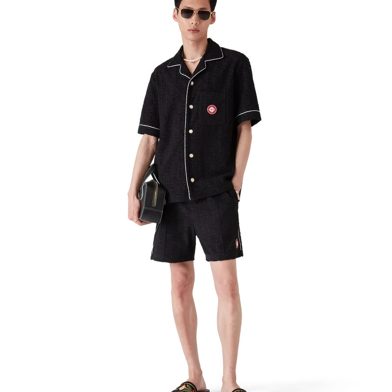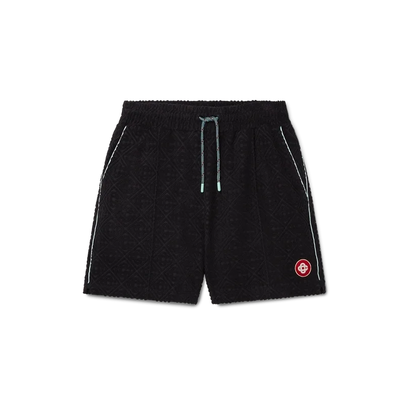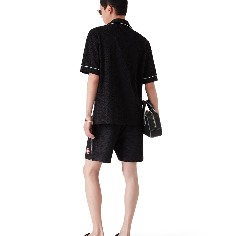 Monogram-frotté-shortsen har et klassisk design og er laget av Monogram-frottéstoff. Den har elastisk linning, snøring med gullspisser, pin-tuck-sømmer foran, baklomme med glidelås, skrå sidelommer og pipingdetaljer på bak- og frontlommene samt ned langs sidene.