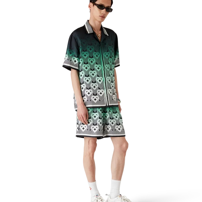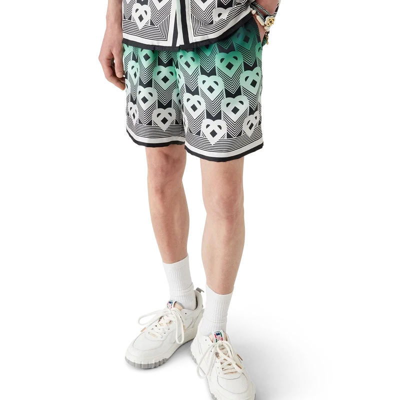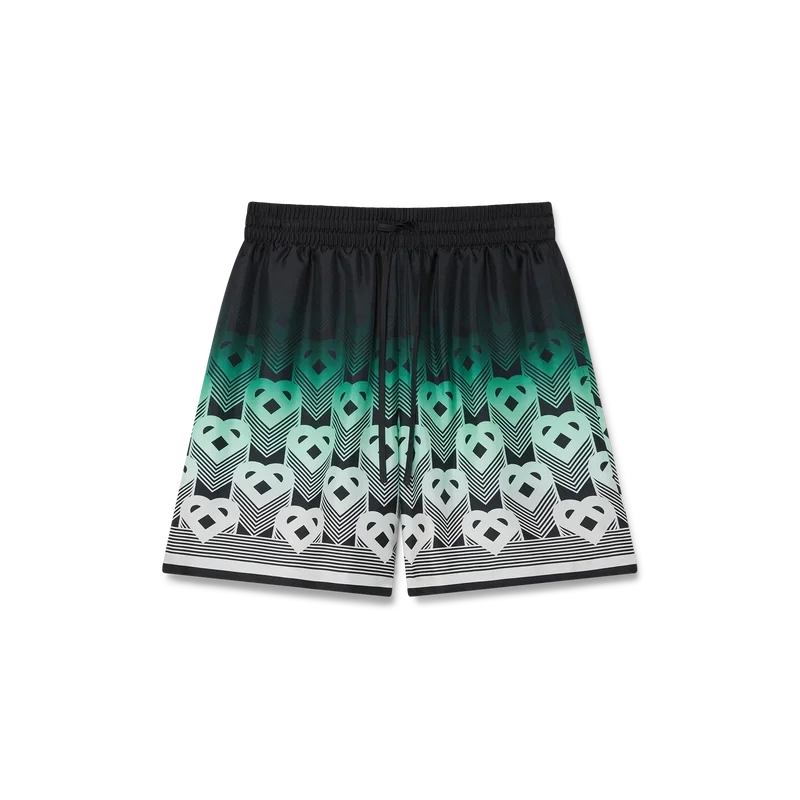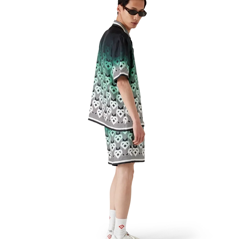 Gradient Monogram Silk Shorts har et heltrykt design med husets hjerte-monogram mot en mintgrønn gradient som bruker fargepaletten til Park Hyatt – et ikonisk hotell i Tokyo som bruker mintgrønt og svart i interiørdesignet – laget av et monogrammert silketwill-stoff. Utstyrt med elastisk linning, snøring, sidelommer, en baklomme og stripete detaljer på kanten.