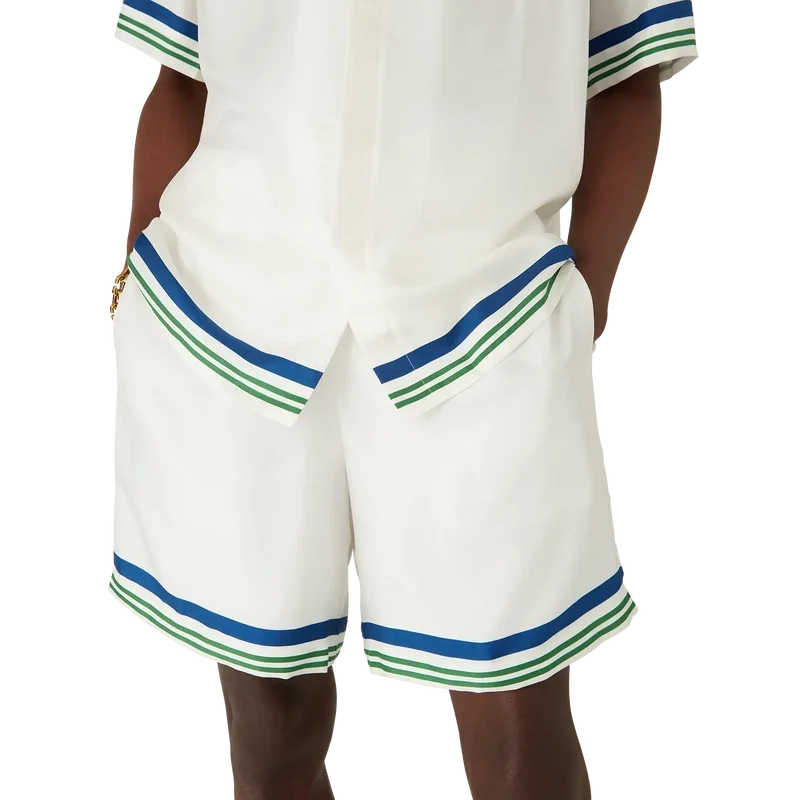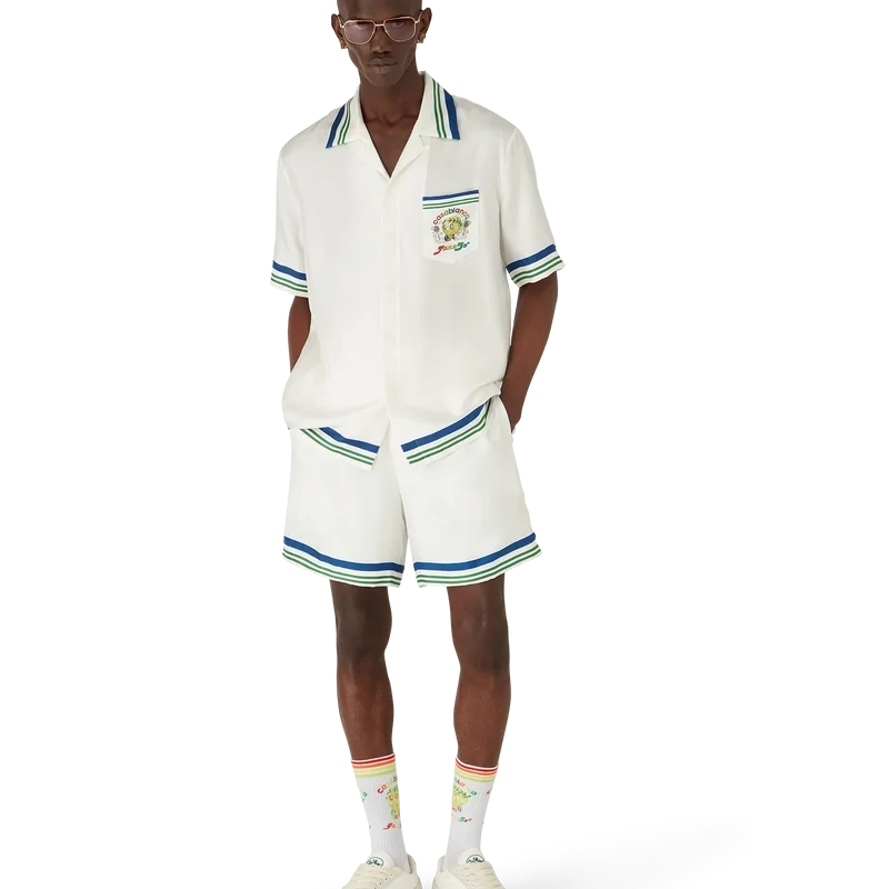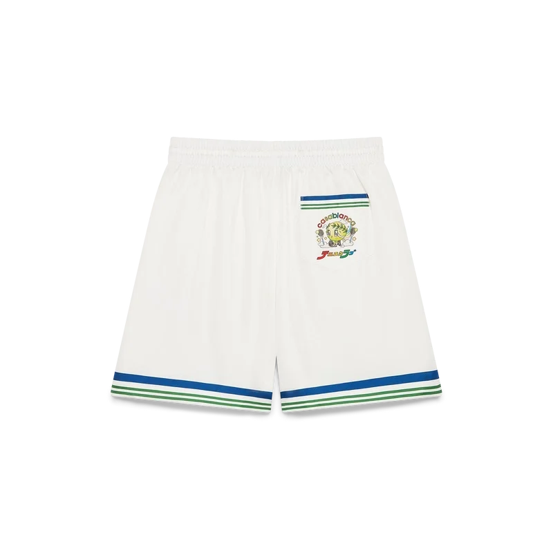 Tennis Club Icon Silk Twill Shorts har et trykt design med sesongens kunstverk av den kawaii tennisballen – denne figuren er en sentral del av vårt univers. Den inneholder elementer som laurbærbladet, Atlantis-sneakeren, racketen og de kawaii øynene. Vi har valgt å bruke denne figuren som det sentrale motivet på alle herremodellene i kolleksjonen. Shortsen har elastisk linning, snøring, sidelommer i sømmen, en påsydd lomme bak og blå, hvite og grønne striper på kanten av baklommen.