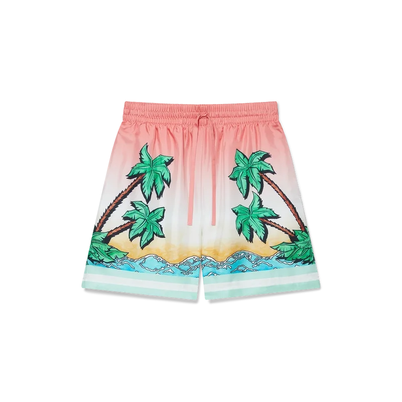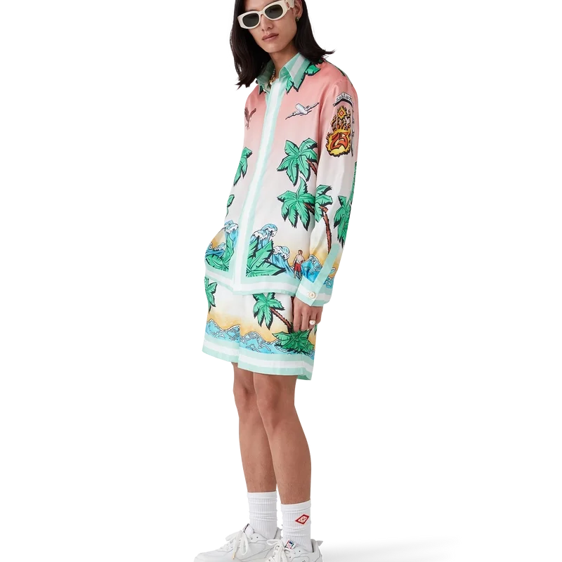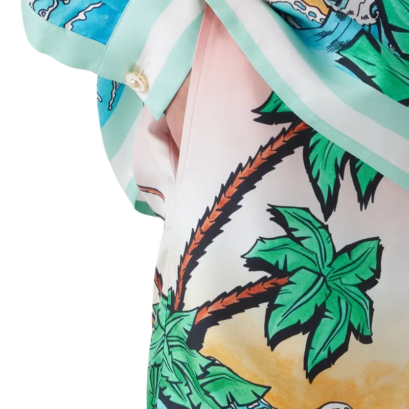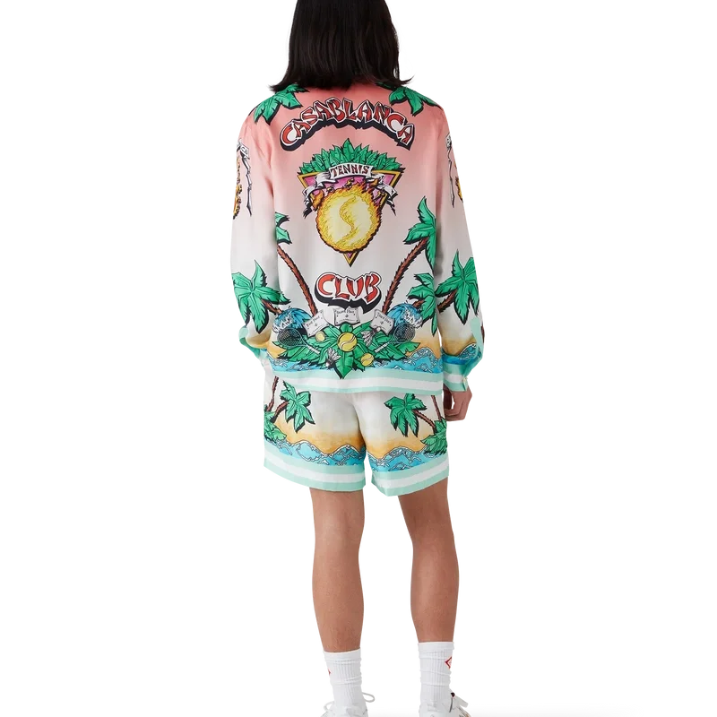 Tennis Club Silk Shorts er en shorts med heltrykt design som viser kunstverk som tolker husets Tennis Club-trykk på nytt i et surfe-tema, i stil med en grafisk skisse tegnet med tusj, laget av silketwill. Utstyrt med elastisk linning, snøring, sidelommer i sømmen, en påsydd baklomme og detaljer i kanten.
