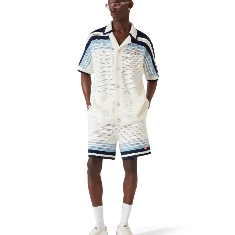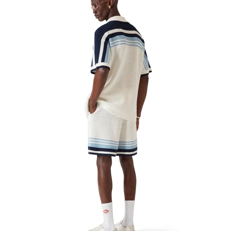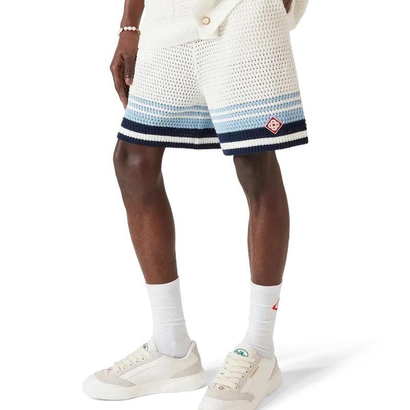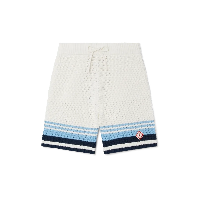De heklede Shortsene har et raffinert design med myk tekstur, laget av et heklet bomullsstoff, med det karakteristiske Tennis Stripe-designet i naturlige farger som danner en gradient-effekt.
