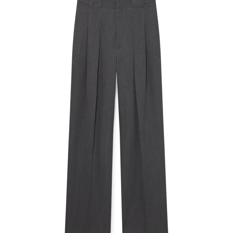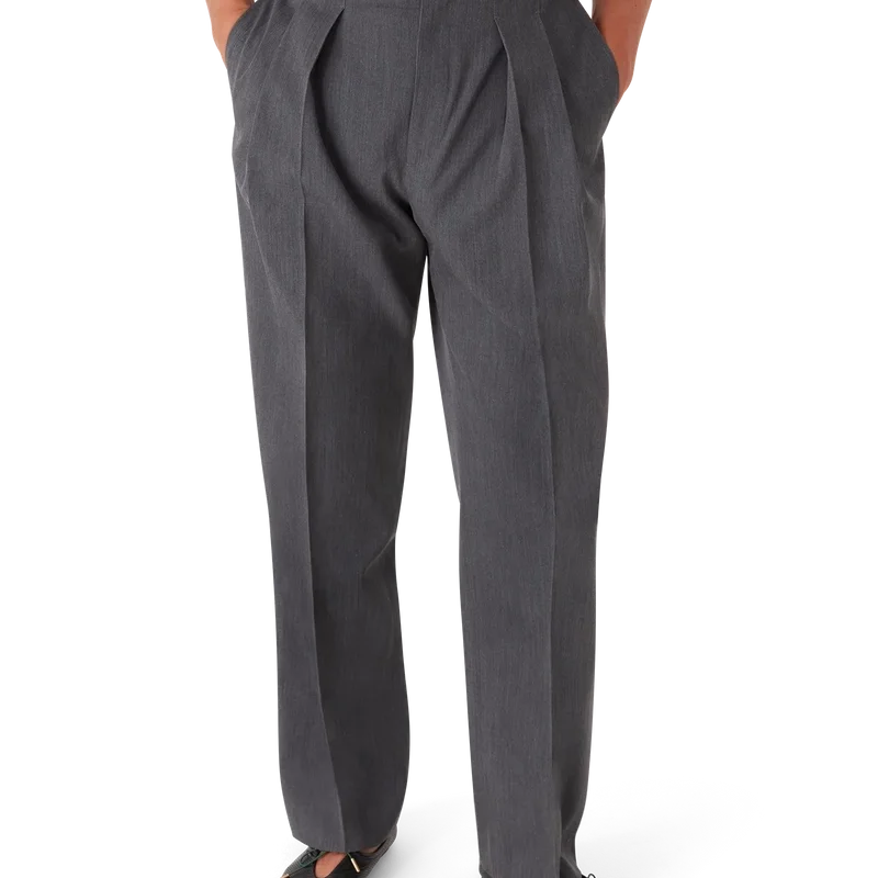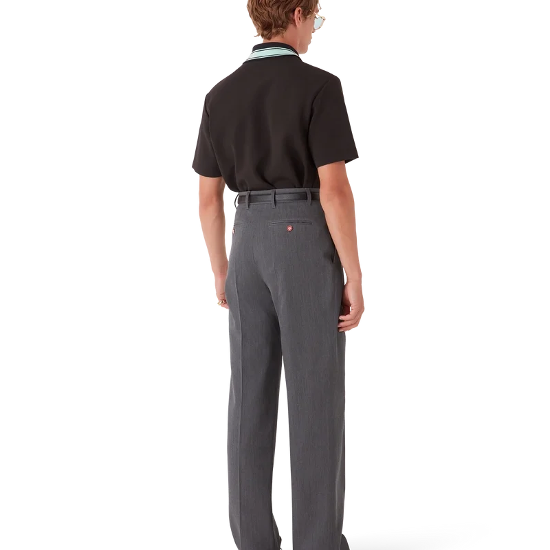 Ullbuksene med beltehemper har et rett ben og er laget av dressstoff. De har plissering foran, glidelåslukking, skrå lommer foran, fôr, beltehemper og baklommer med husets sammenflettede Cc-logo i gullbelagt, emaljert knapp med flat skaft.