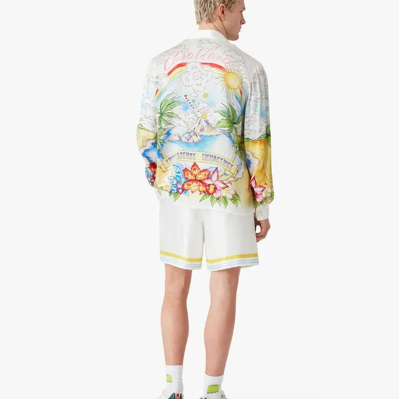 Better Days langermet silkeskjorte har et heltrykt design med kunstverk som beskriver den utopiske visjonen om Ibiza som et reisemål for en nesten religiøs oppdagelsesreise gjennom det mangfoldige musikalske landskapet. Fullført med krage i kubansk stil, knappestolpe, sammenflettede Cc-logo-knapper i corozo, brystlomme og emaljeknapper med gullkant på mansjettene.