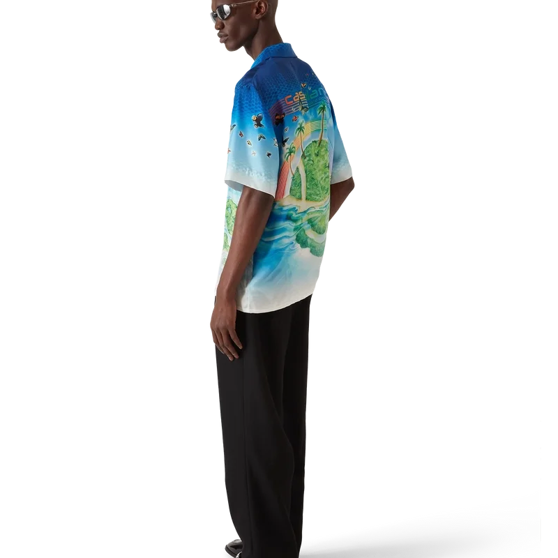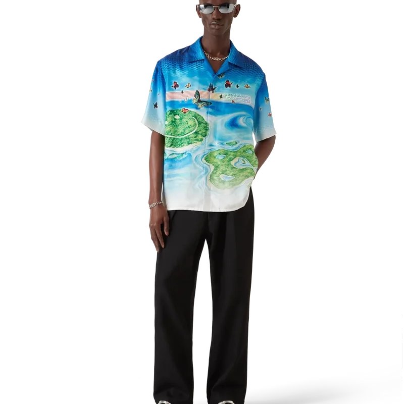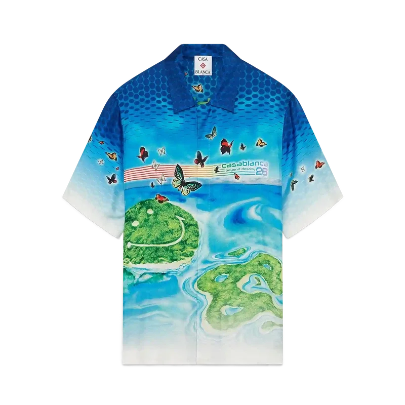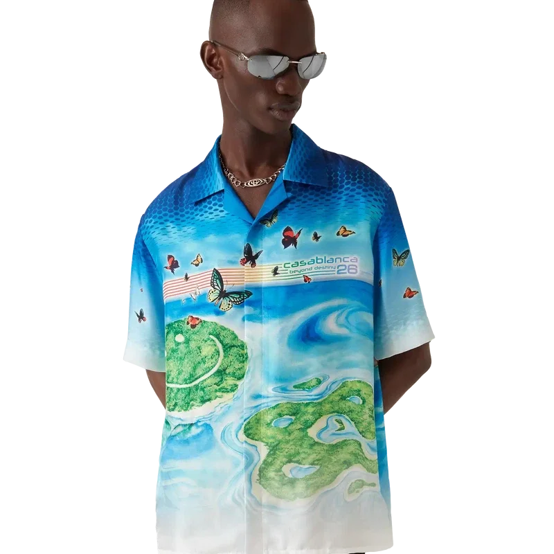 Beyond Destiny-skjorten med korte ermer er en ny tolkning av den klassiske Casablanca-souvenirskjorten i silke gjennom et digitalt kunstfilter, med halvtonegradienter lagd på lag med motiver inspirert av videospill. Håndmalte sommerfugler og drømmende øylandskap smelter sammen med husets CC-logo, som selv er forvandlet til øyer – symboler på flukt, glede og identitet. Fullført med kubansk krage og korte ermer.