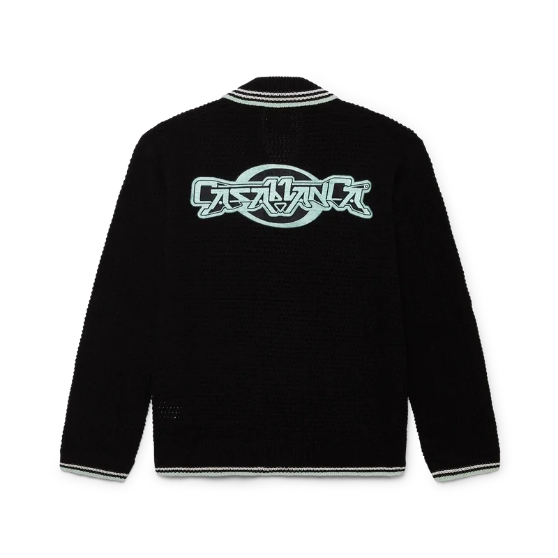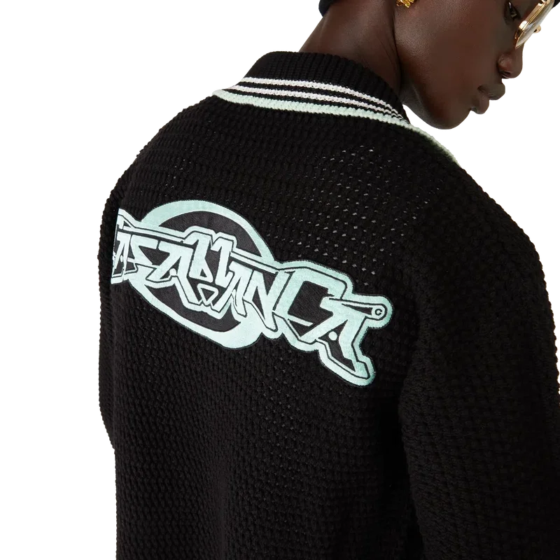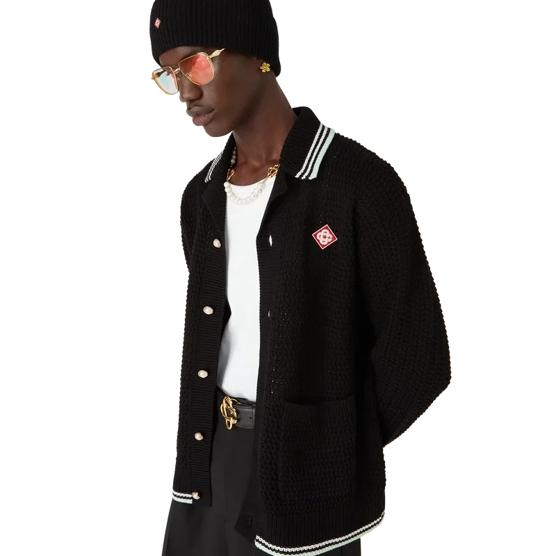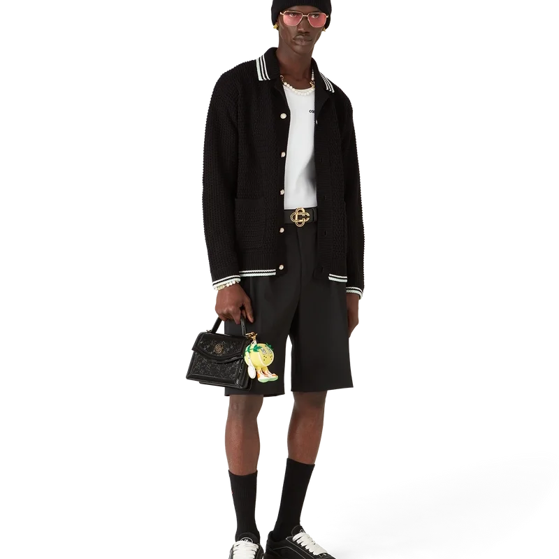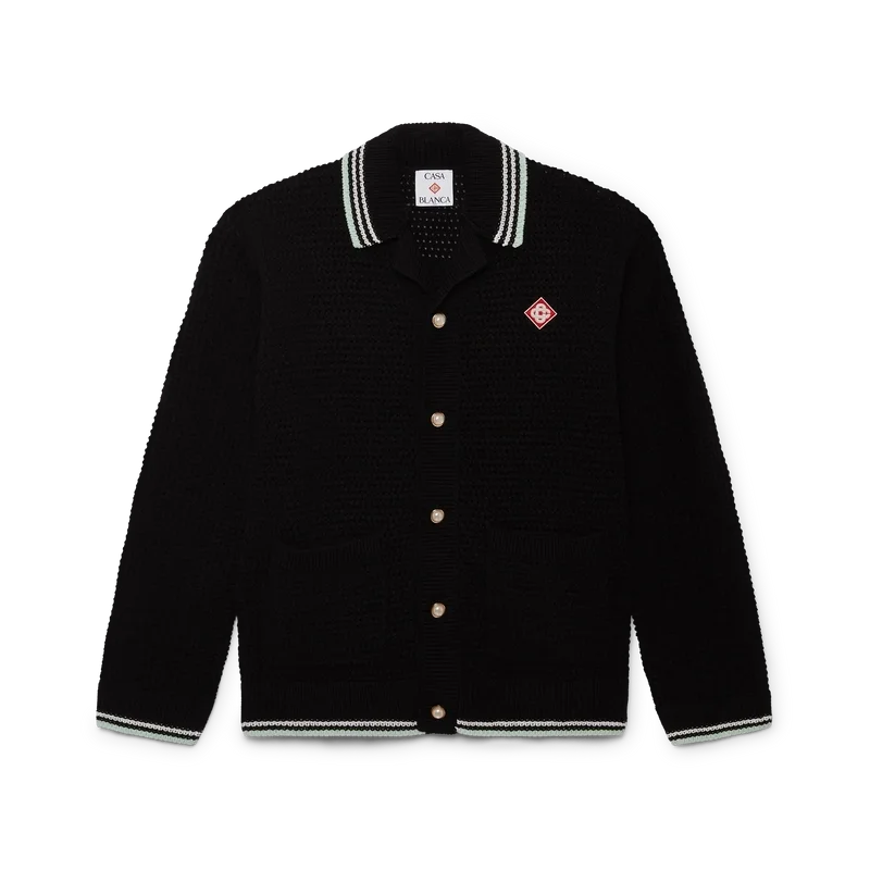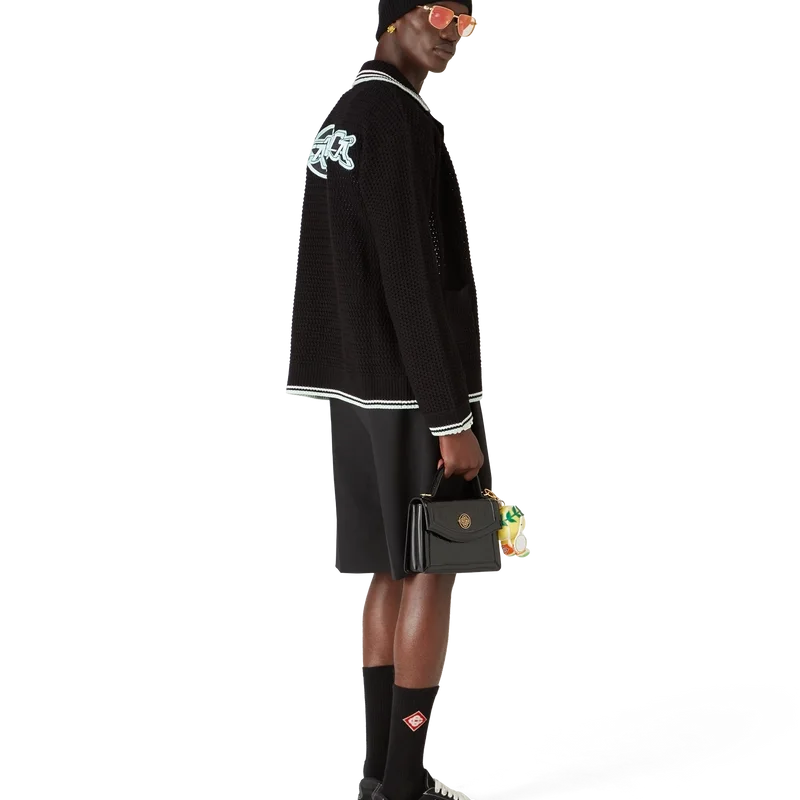 Den broderte bomullskroket-skjorten med lange ermer er et klassisk design med husets signaturdiamantlogo, som knytter seg til Capsule-kolleksjonens reise- og ferietema. Fullført med ribbestrikket krage, mansjetter, nederkant og knappelukking, påsydde lommer foran, knappelukking, signaturknapper med gullkant og perler, samt detaljer med striper i svart, mint og hvitt på mansjetter, nederkant og krage.