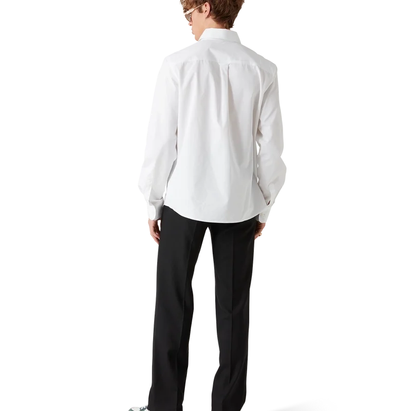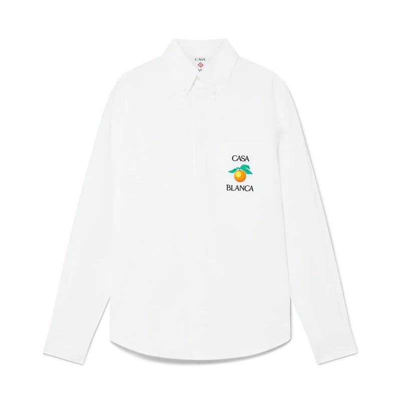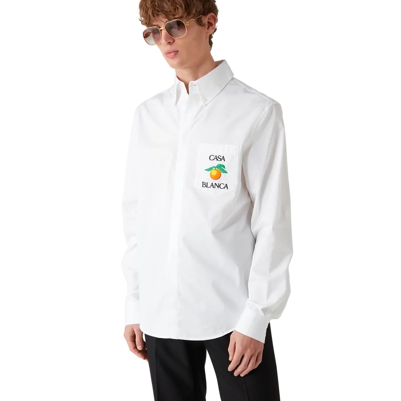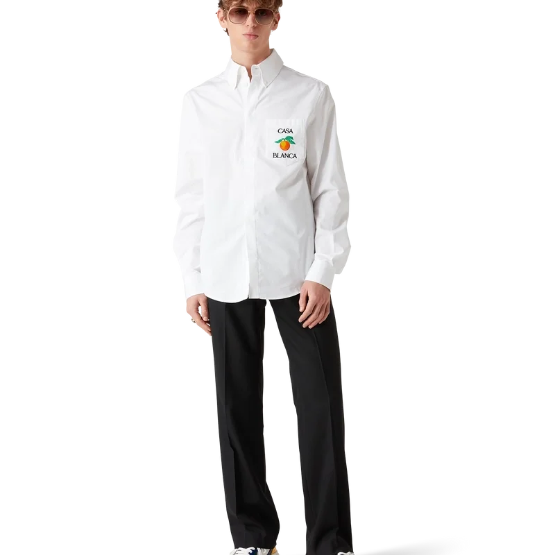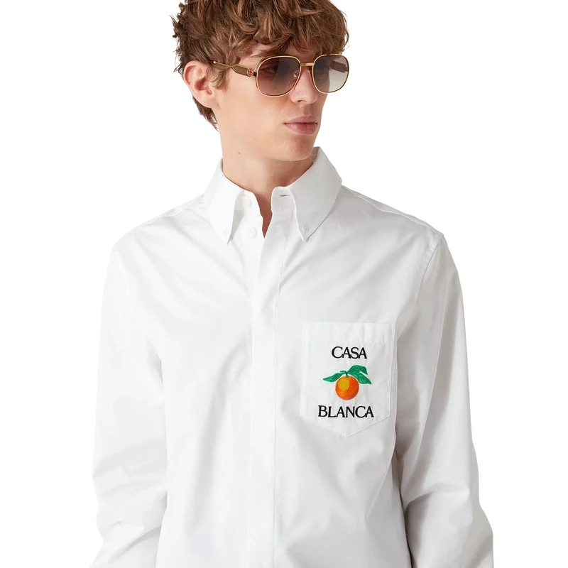 Den broderte oransje Oxford-skjorten er en langermet modell, laget av bomullsstoff og har et brodert oransje motiv – et av husets designelementer – og Casablanca-tekst. Fullført med brystlomme, spiss krage med knapper, skjult knappelukking foran og Corozo-knapper med sammenflettet Cc-logo.
